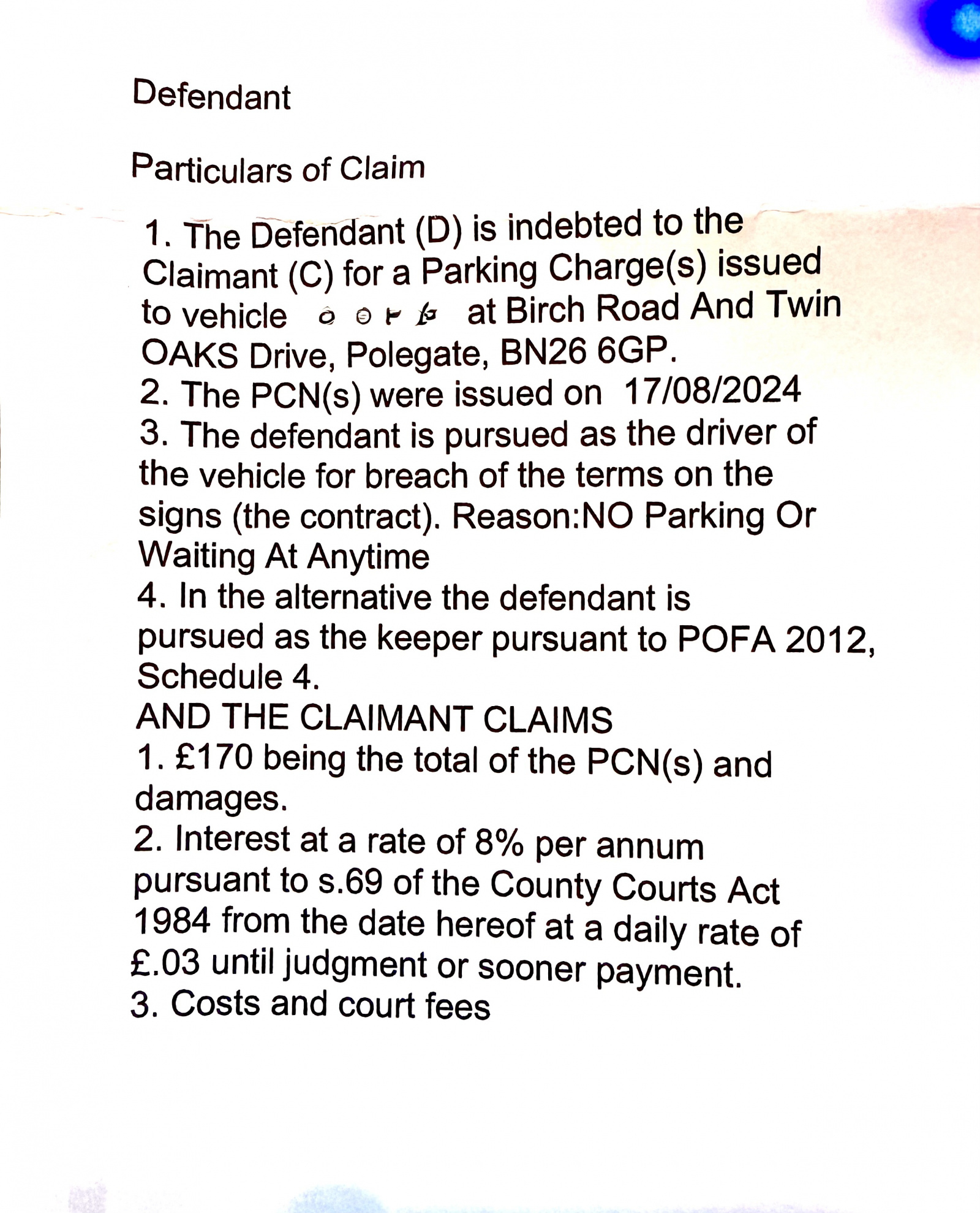 3. Referring to the POC: paragraph 1 is denied. The Defendant is not indebted to the Claimant. Paragraph 2 is denied. No PCN was "issued on 17/08/2024" (the date of the alleged visit). Whilst the Defendant is the registered keeper, paragraphs 3 and 4 are denied. The Defendant is not liable and has seen no evidence of a breach of prominent terms. The quantum is hugely exaggerated (no PCN can be £170 on private land) and there were no damages incurred whatsoever. The Claimant is put to strict proof of all of their allegations.