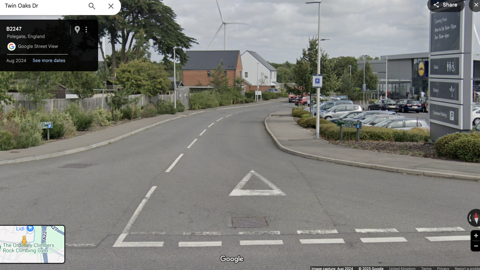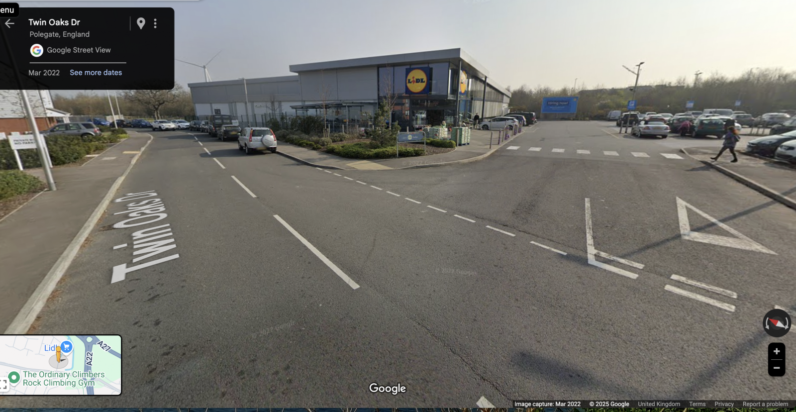 At the entrance to Twin Oaks drive there is a huge LIDL sign displaying opening times etc. Adjacent to this, 10cm from the grass verge of the Lidl car park, is another sign with a small NPC logo and a large P in a blue box. This is the universally accepted highway code sign signifying a place suitable to park or where parking is permitted. In a small font above the large P are the words PRIVATE LAND. In a very small font below are the words See Signs in car park for details. This sign is positioned in such a way that drivers might reasonably assume that once they have travelled past the sign they will have entered an area upon which parking is permitted, but time restrictions will apply, as they do in most supermarket car parks.Approximately 50m from the entrance to Twin Oaks Drive is a right turn which leads to the main Lidl car park. Adjacent to this entrance, on the east side of the road, are several car parking spaces with a dropped kerb allowing shoppers to access a path that leads to the trolley pickup area. My 85 year old mother uses these spaces as they are in close proximity to the trolleys and store entrance. Since the death of my father we no longer have a blue badge so cannot yet use the disabled parking bays in the main car park, though we are applying for one.
