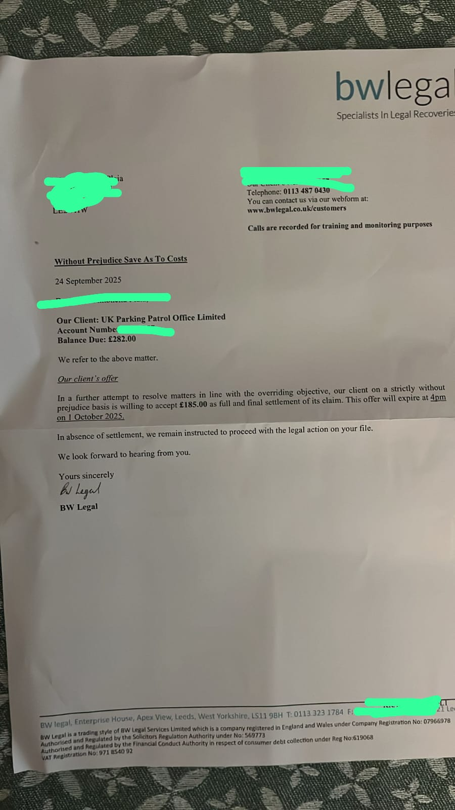 I've sent Without Prejudice email to BW Legal offering £100 pound for which a didn't receive email back other proof of delivery.