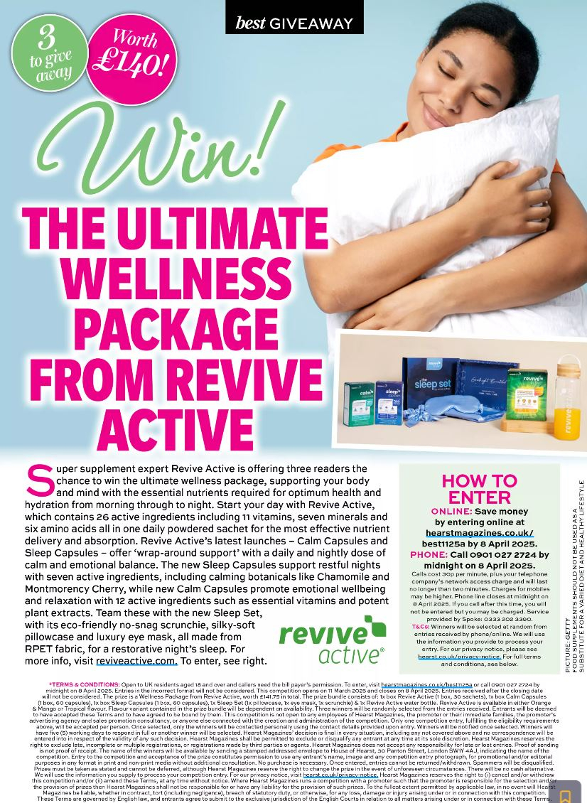 The prize is a Wellness Package from Revive Active, worth £141.75 in total. The prize bundle consists of: 1x box Revive Active (1 box, 30 sachets), 1x box Calm Capsules (1 box, 60 capsules), 1x box Sleep Capsules (1 box, 60 capsules), 1x Sleep Set (1x pillowcase, 1x eye mask, 1x scrunchie) & 1x Revive Active water bottle. Revive Active is available in either Orange & Mango or Tropical flavour. Flavour variant contained in the prize bundle will be dependent on availability. Three winners will be randomly selected from the entries received.