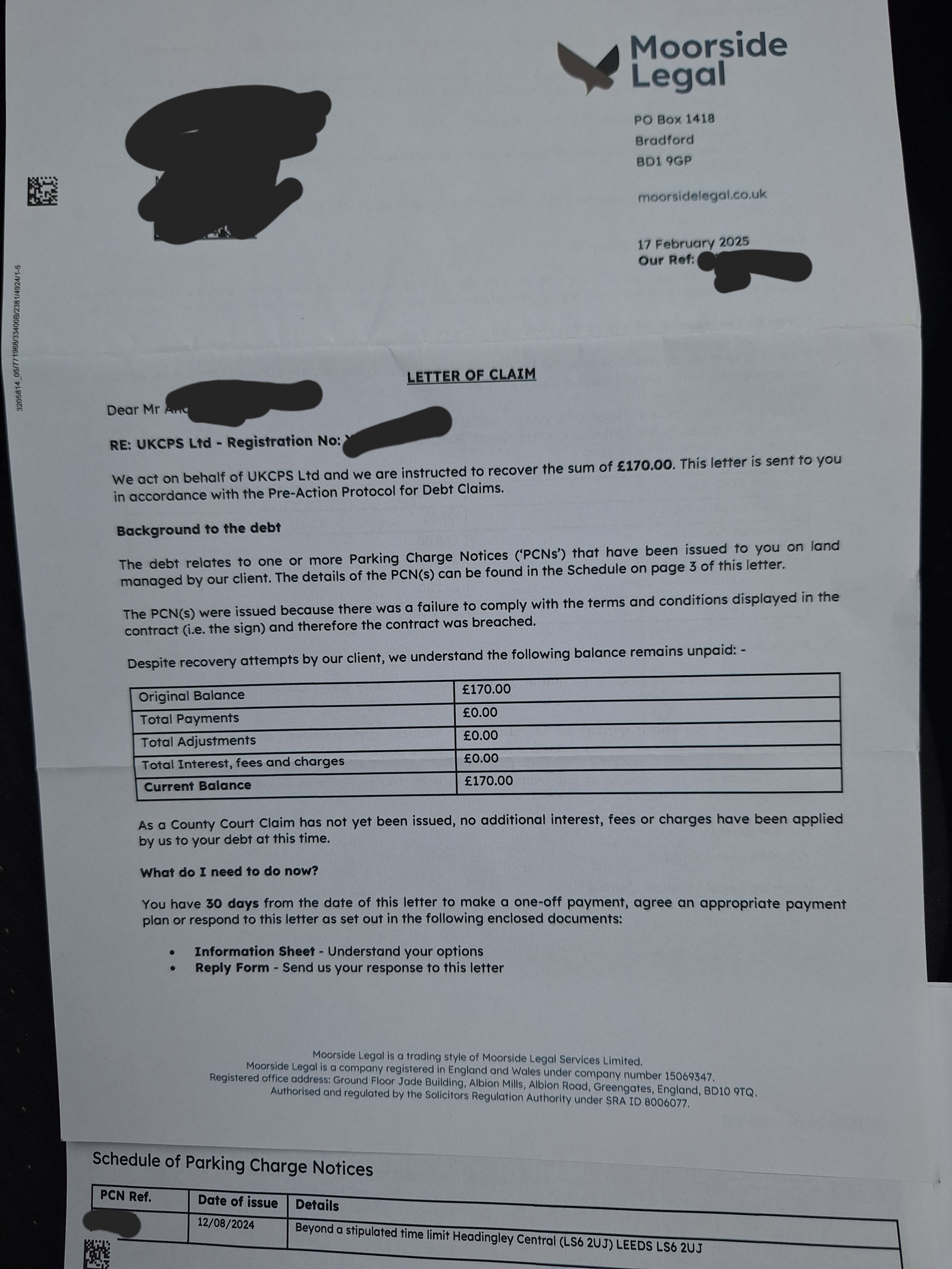 Our client: UKCPS LtdOur answers to your questions are as follows:The additional charge which has been levied on your Parking Charge of £70 is the amount set out in both the British Parking Association and International Parking Community Codes of Practice as the amount which may be added to a Parking Charge when a Parking Charge remains unpaid and when further recovery is required. Our Client adheres to the ATA’s Code of Practice. The £70 does not represent the cost of recovery but is a reasonable amount in relation to the Parking Charge amount, in order to encourage early payment of the Parking Charge without the need for debt recovery. It is a fair amount set by our Client’s government-approved Accredited Trade Association Code of Practice. There are however also costs incurred by our client in relation to debt recovery services.By entering and parking the vehicle on our client's private land, you agreed to enter into a contract with our client and to be bound by the terms and conditions of that contract. The terms and conditions were clearly displayed at the entrance and in prominent places within the car park. Due to your failure to comply with the terms and conditions, our client has issued the PCN therefore if we are instructed to issue a claim the reason would be for Unpaid parking charges/ breach of contract.We have noted on your account you are seeking debt advice and have placed the matter on hold for 30-days. If you fail to make payment after the 30-day period has lapsed, we may be instructed to issue a County Court Claim against you.You may wish to seek independent legal advice.Yours sincerelyMoorside Legal0 -