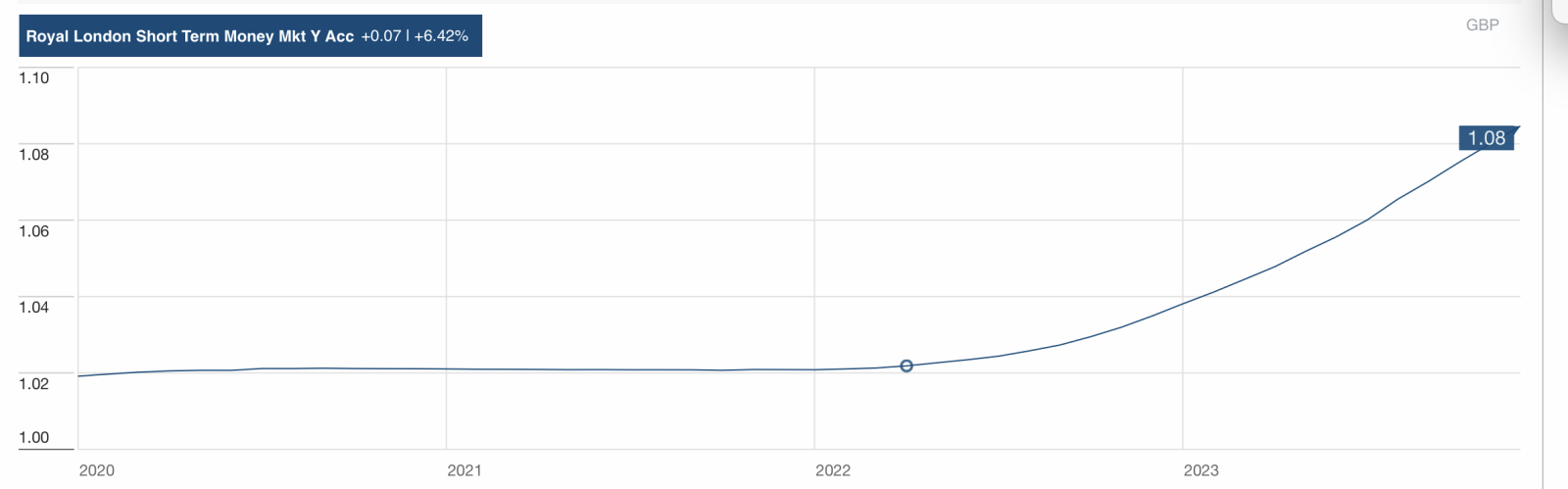 As for changes in rates for MMF, they tend to be gradual (the time taken to reflect changes depending on the maturity of whatever is held), e.g., the following graph shows the NAV for the RL MMF (acc) fund. The gradient gives the rate and this gradually steepened as the bank rate, 3 month treasury bill rates and short term commercial rates all increased from early 2022 onwards. It is also why looking at yield to maturity (forward looking) and not distribution yield (backward looking) is important.