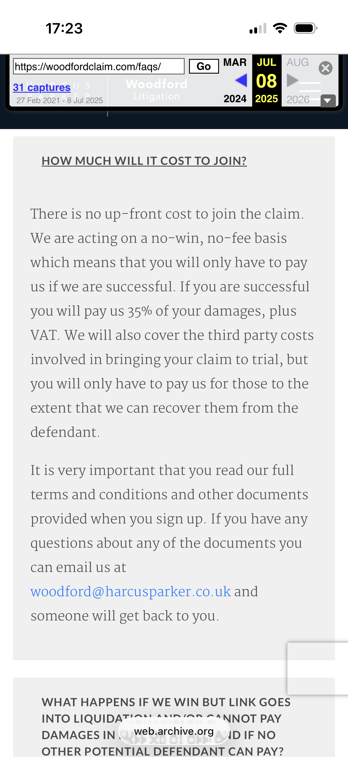 "If you are successful you will pay us 35% of your damages, plus VAT"MapsterUK said:Interesting that Harcus Parker’s Woodfordclaim.com seems to be down. Luckily I kept an archive of the FAQ You only have to pay if WE are successful! You only have to pay if WE are successful!