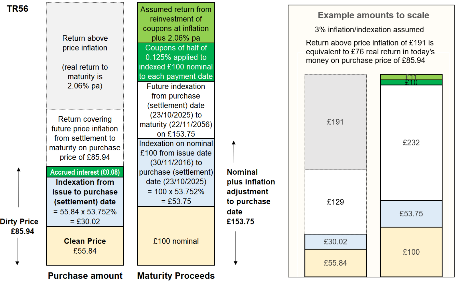 Using the example of TR56 above the image below diagramatically shows what is happening if you buy £100 nominal of this index linked gilt (based on yesterdays closing price). Note that while you are buying £100 nominal there has already been some indexation (i.e. inflation increase) of £53.75 since it was issued. The clean price you may see quoted (£55.84 in this example) doesn't take into account the indexation which has occurred so far while the dirty price that you actually pay (£85.94 in this example) does take into account the indexation to date as well as the accrued interest since the last coupon on 22nd May.