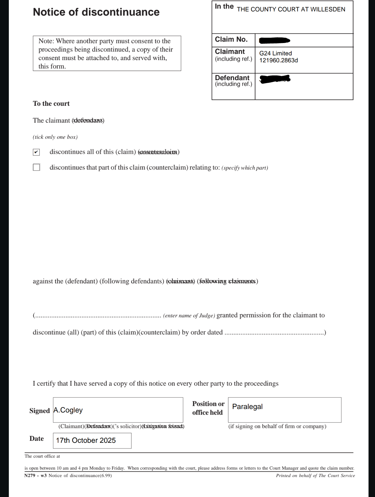 Discontinued in time to avoid any costs potential.Please note, we are not a legal advice forum. I personally don't get involved in critiquing court case Defences/Witness Statements, so unable to help on that front. Please don't ask. .