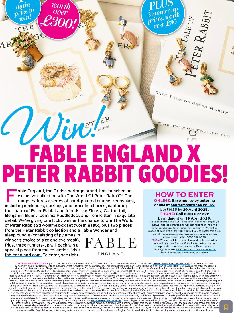 The prizes consist of one main prize for 1 winner, which consists of The World of Peter Rabbit 23 Volume Box Set, 2 x pieces from the Peter Rabbit collection and a Fable Wonderland Sleep bundle (consisting of pyjamas in winner's choice of size and eye mask), worth £309 in total. 3 x Runners Up prizes will consist of one piece from the Peter Rabbit Collection, worth £33 each. One main winner and three runners up will be randomly selected from the entries received.