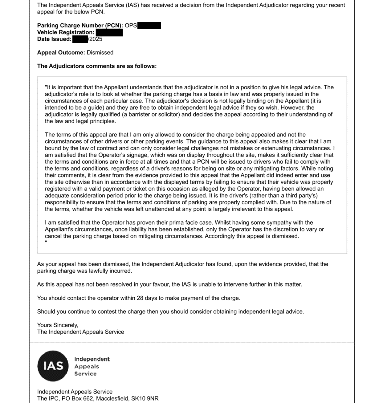 Well overdue but posting my IAS outcome here. It's the classic IAS dismissal with zero consideration of anything that was put into the appeal. Generic decision that has been deployed with zero changes for years against motorists.