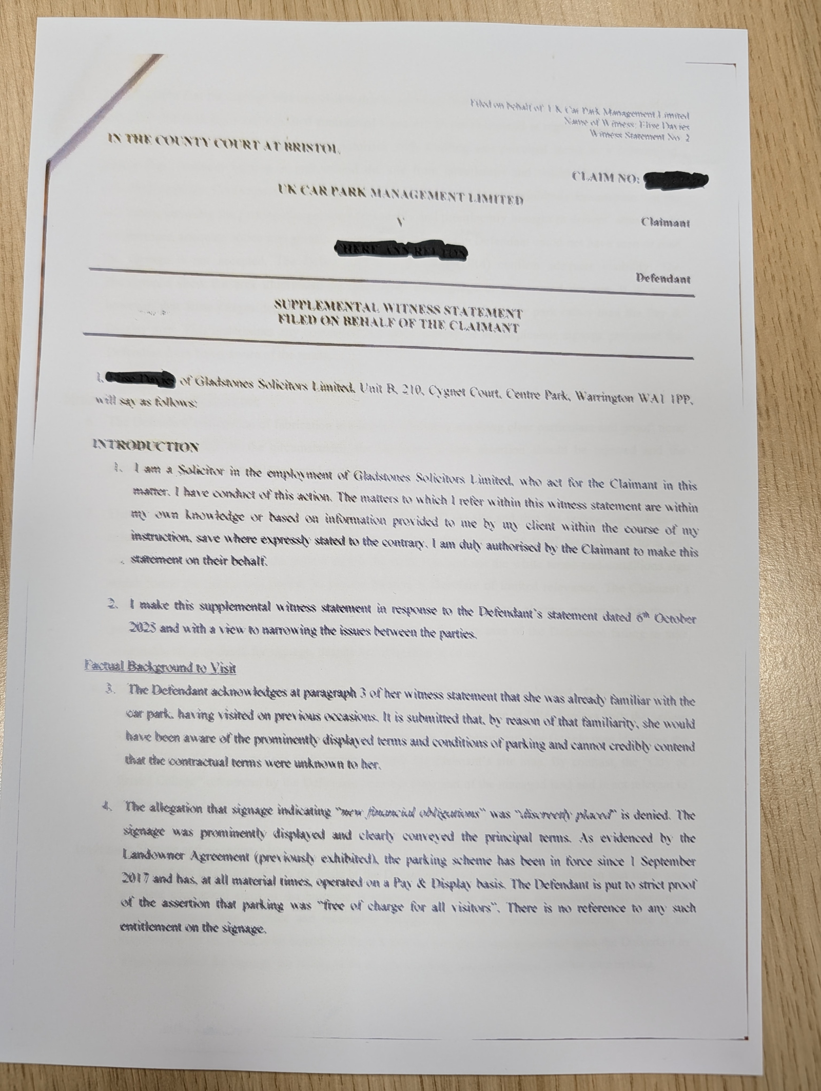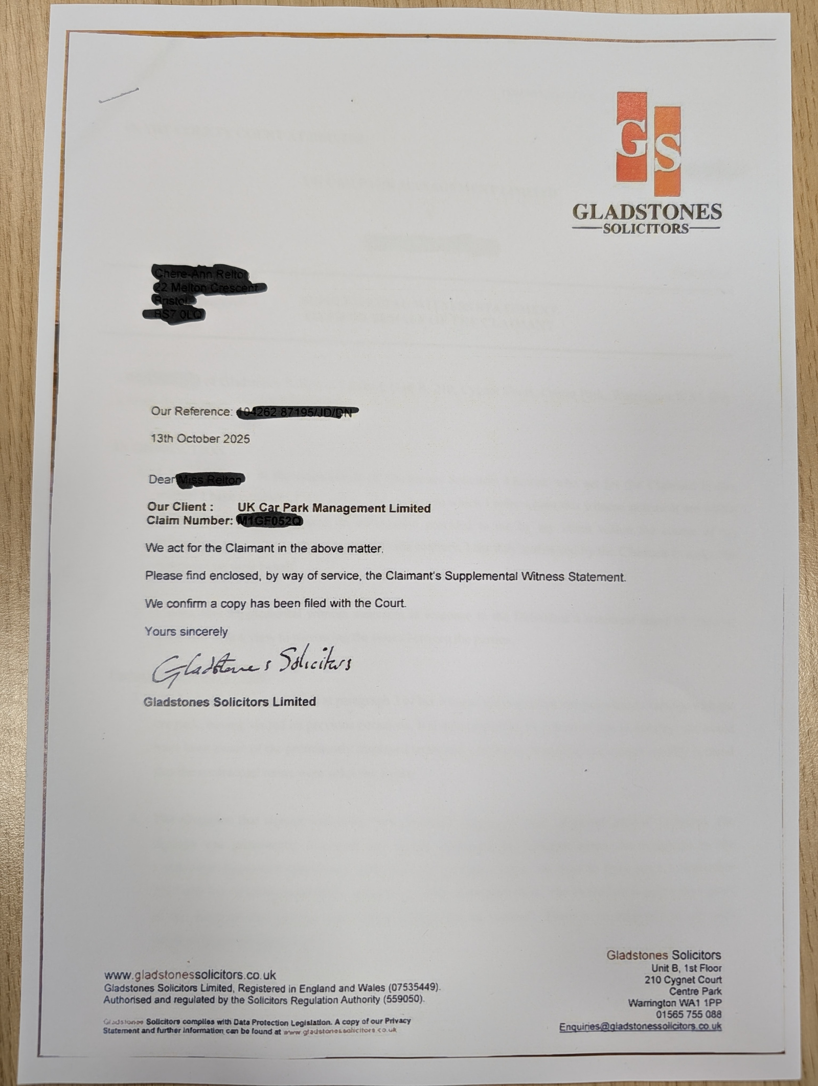 "Gladstone Solicitors involved, the case is now at the stage that I have received letter from court that my Defence has been receipted, and that copy of my defence has been sent to the Claimant."