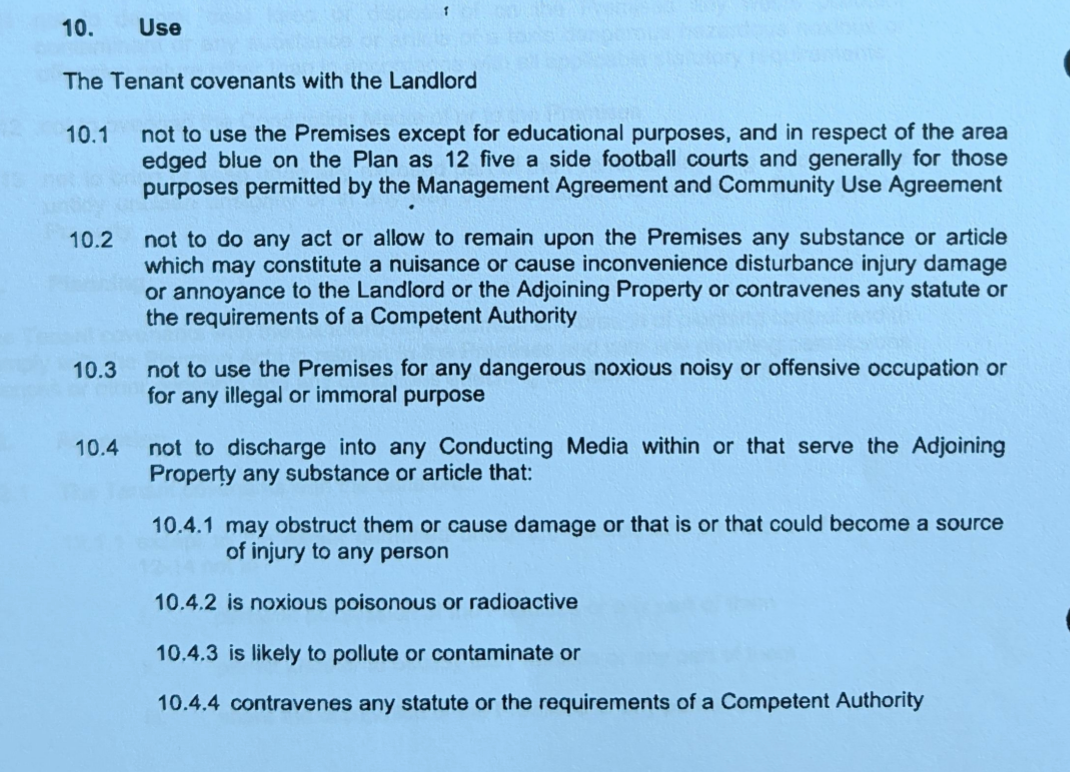 I have check the entire lease agreement and there is Clause 10.1 which strictly limits the use for "education purposes" and in respect of the area edged blue on the Plan as 12 five a side football courts and generally for those purposes permitted by the Management Agreement and Community Use Agreement.