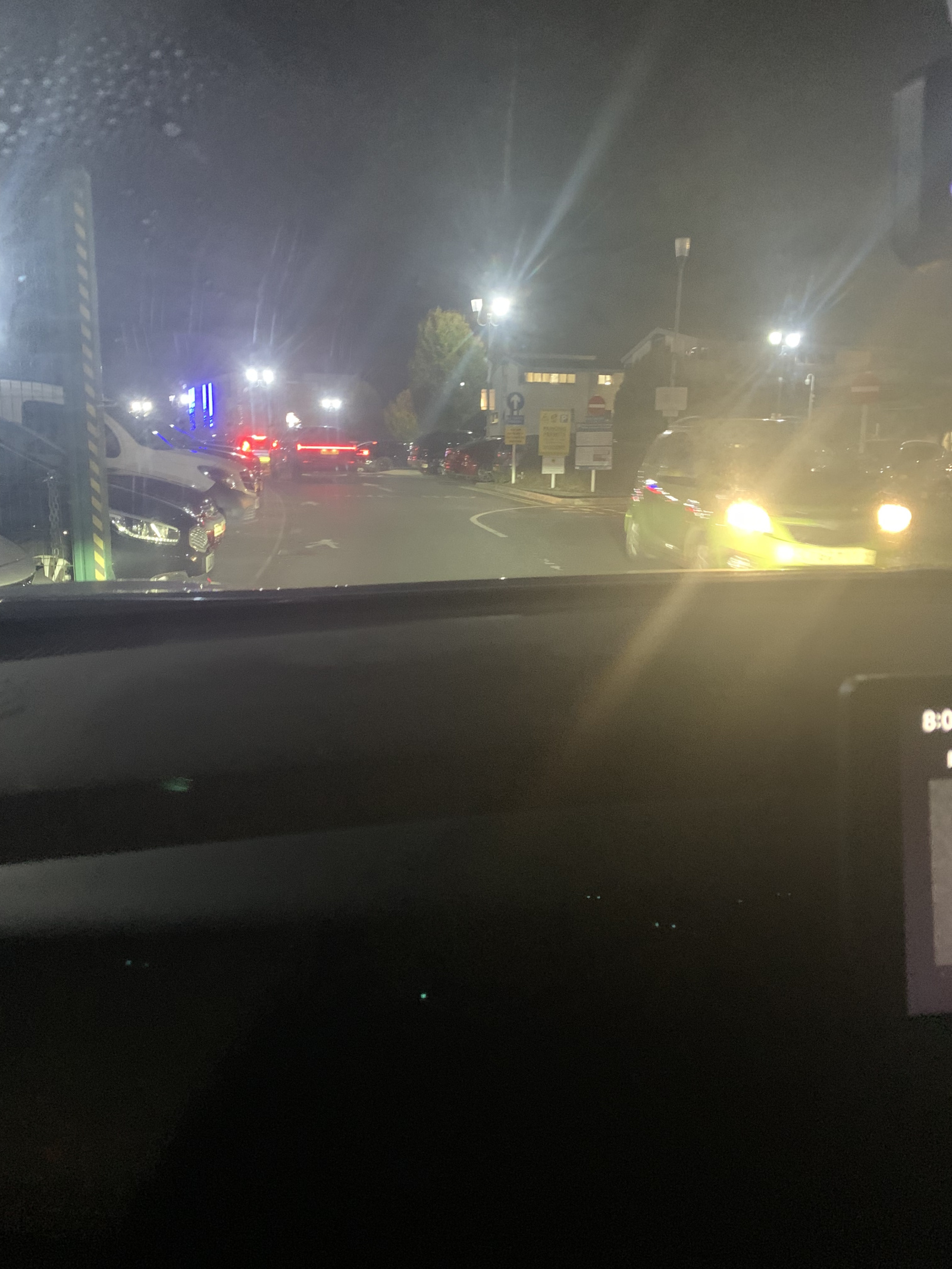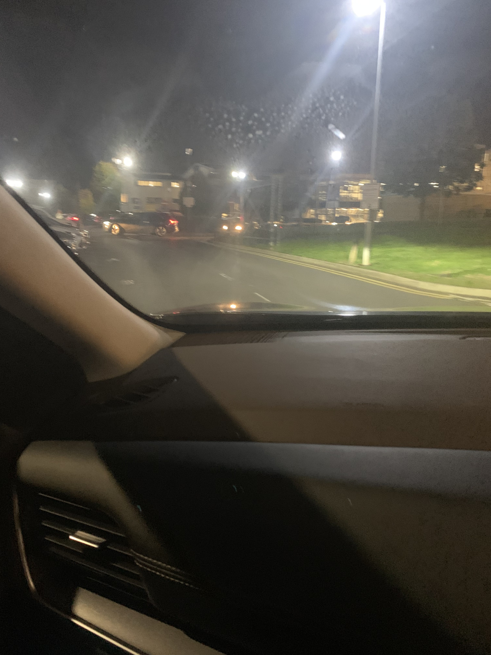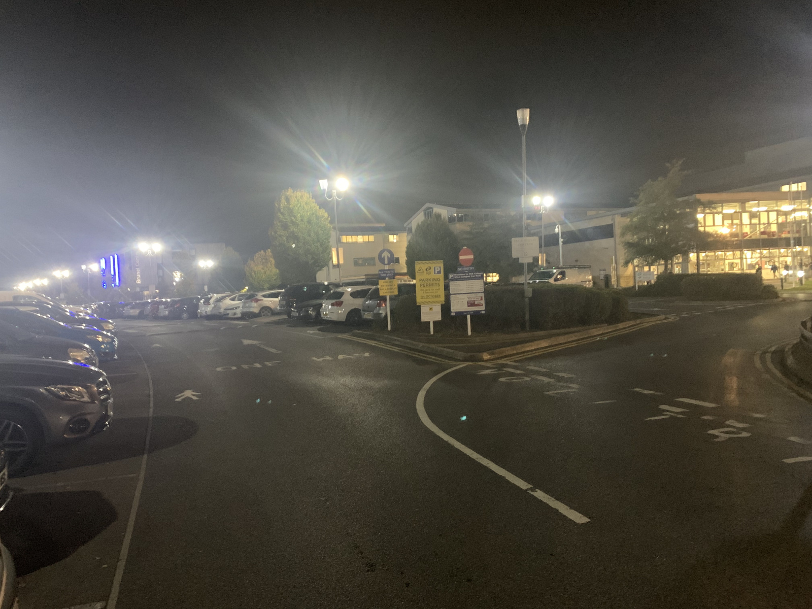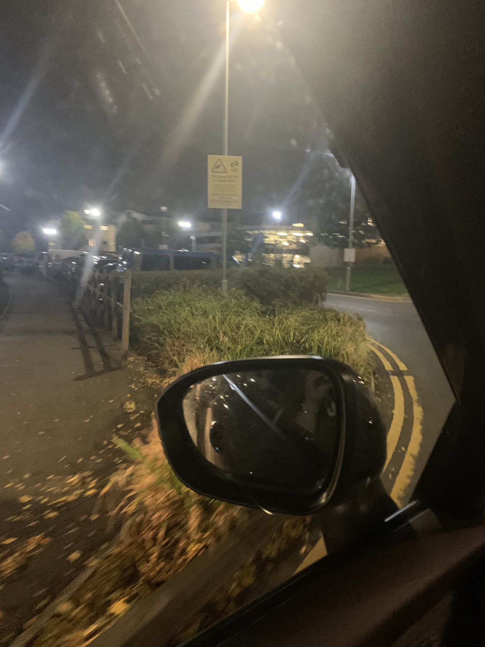 Note the light dazzle from incoming cars, the entry signs placed on the opposite side of the road while being in shadow of separate lamp posts positioned far behind but directed straight int the drivers eyes.