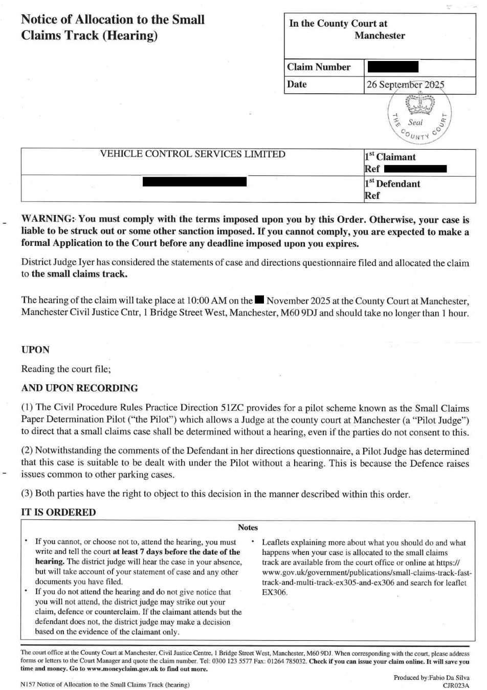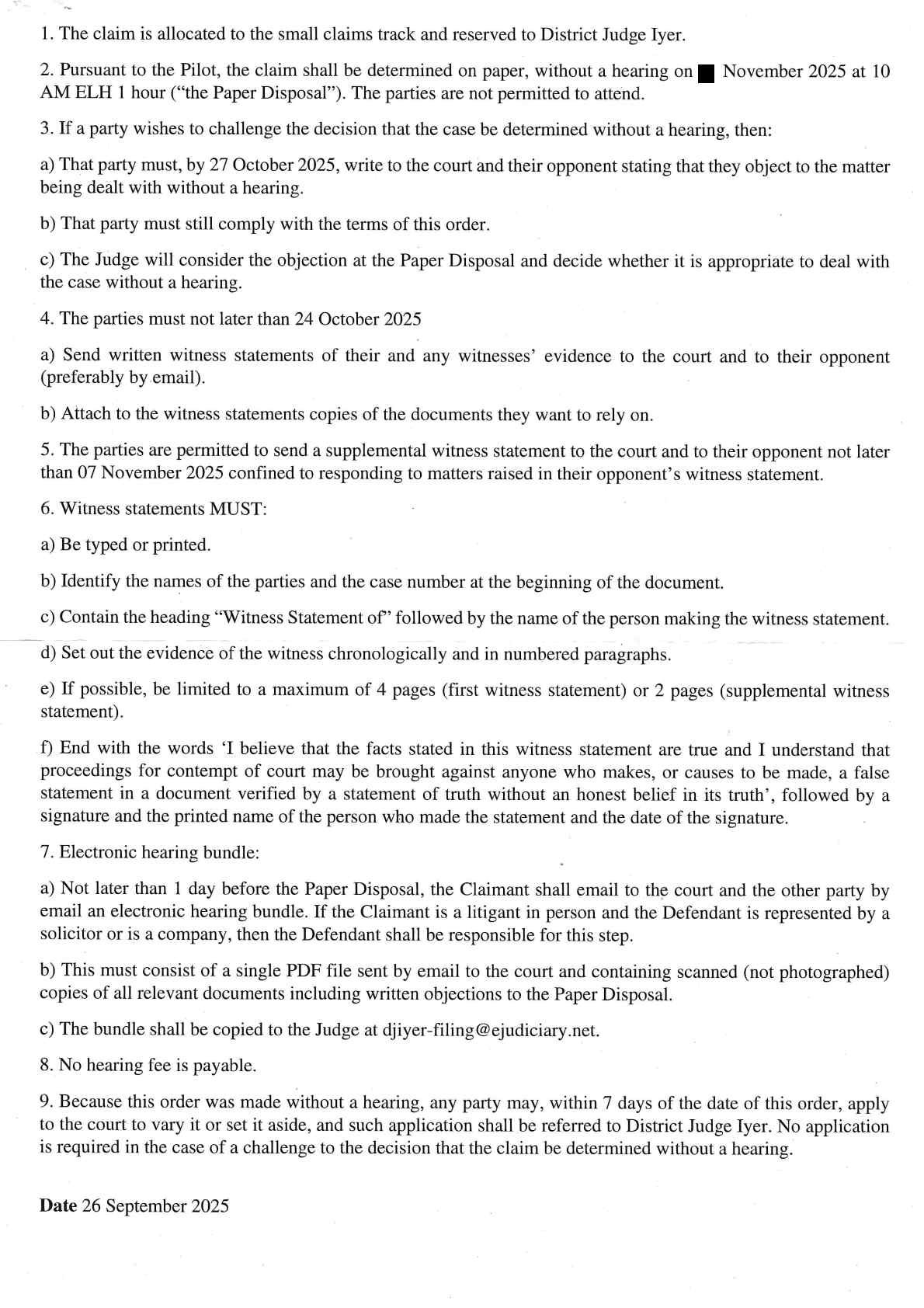I have finally received the Notice of Allocation to Small Claims track and it's going through the Small Claims Paper Determination Pilot next month. I was hoping that the Claimant would withdraw up to now so it looks like I'll have to prepare the witness statement. Please see below copy of the notice and it seems like there is no hearing and the judge is going to decide based on the information available.