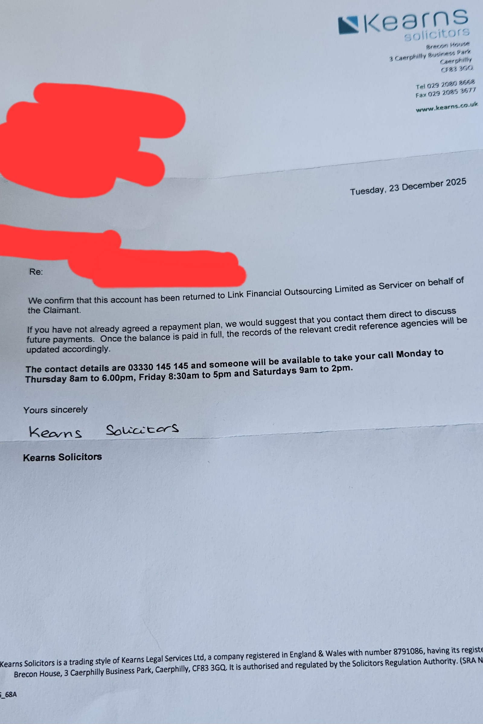 I understand your reluctance to share personal details with vultures like Kearns, especially with what you have going on elsewhere in your life, but as they are unaware of your personal circumstances, they will keep pressing ahead with this as they have no reason not too.