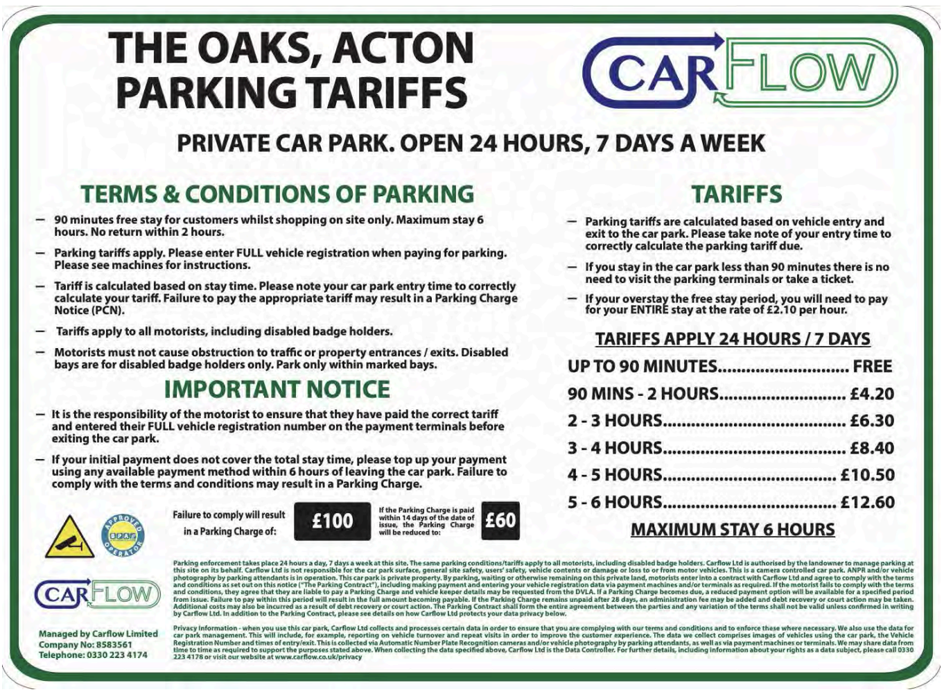 I’m looking for advice after receiving a rejected appeal from Carflow for a PCN issued at The Oaks car park. At the time, I made a payment of £4.20, genuinely believing this was the correct amount to cover my stay after the 90-minute free period. The signage at the location advertised £2.10 per hour and I thought I was doing the right thing by paying.