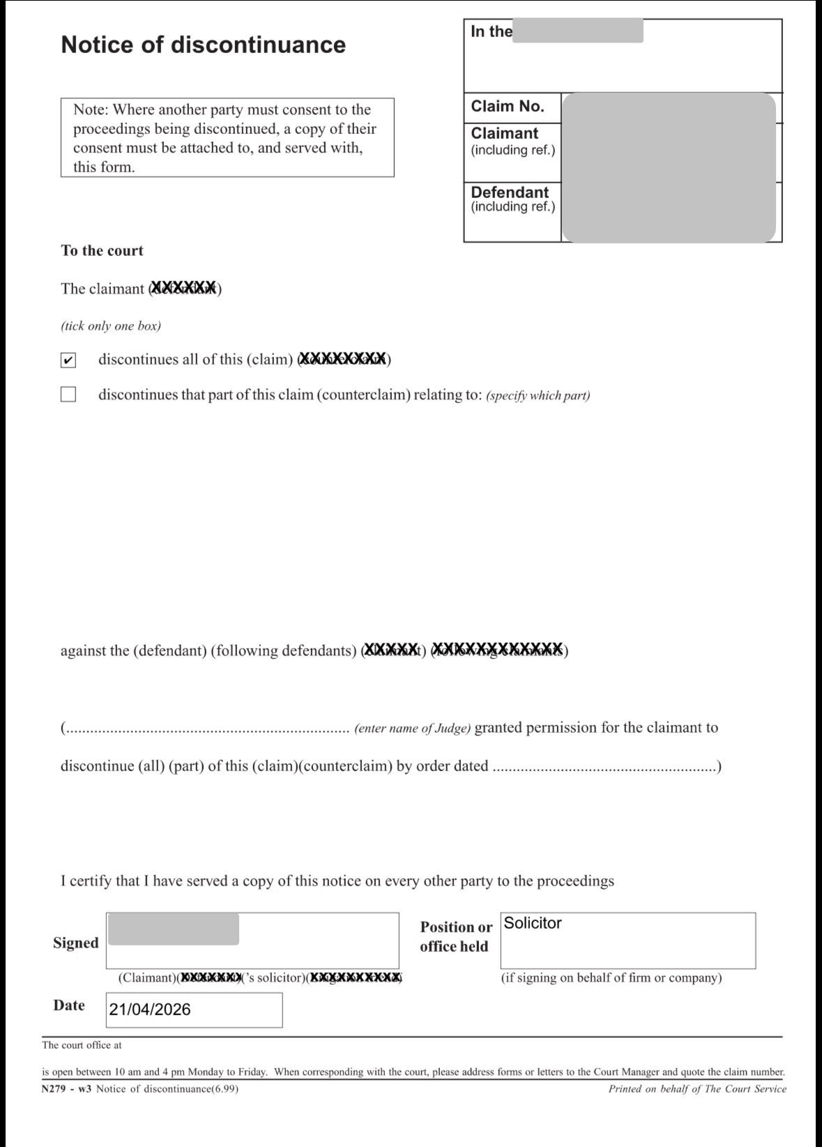 Just received an email with had a Claimant’s N279 Notice of Discontinuance from DCB Legal.