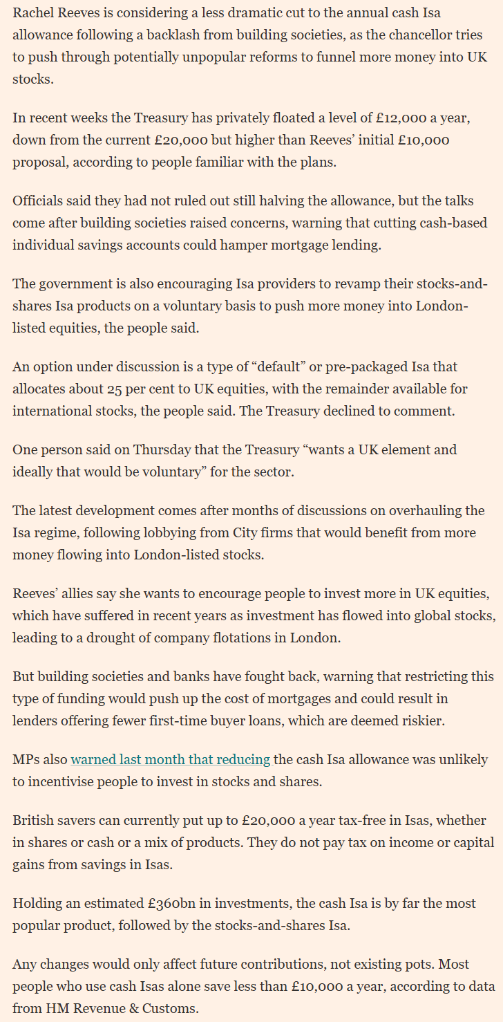 Papers just copy each other, so it could be a leak, or it could just be a rumour echo to fill space.ivormonee said:More newspapers are reporting the latest pseudo-leaks from the govt. today in relation to a £12k cap on cash ISAs, first mentioned a few days ago but now being more widely reported. Again though, it's just speculation.1 -