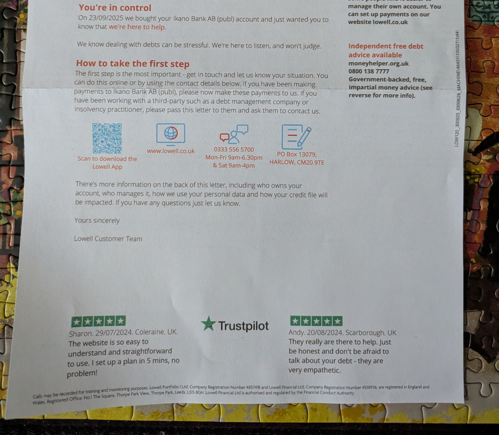 Hey everyone, checking back in on my next steps if I could please. I've received the attached letter from Lowell, a debt collection/purchaser, alongside a letter from Ikano saying that Lowell have purchased my Ikano debts because they've defaulted (that letter wouldn't upload for some reason). Today my Ikano debts have also shown as defaulted on my Equifax report, as Fixed Term Credit Sale, and will also be removed from my next report (according to Clearscore). The letter was dated Sept 30th but life has been hitting us hard, and the Clearscore notification this morning prodded me to post. - Does this letter from Lowell effectively start the default clock again? IE should I wait for the Lowell account to default now (if that's even a thing?), giving me another few months to save for a settlement figure? - or should I offer them a settlement figure now, or just set up a standing order of what I can afford? - is it sensible to set up an online account for them, or is that overdoing it? It'd be useful to see how much we owe etc but I've held off for now. - I've seen mention of strategies a fair bit here, are they detailed anywhere? I know there's the pinned post but it feels like it's not step by step enough for me unfortunately, so any pointers for step by step of "when you get a letter that says x do y" would be amazing, I work great with those! I've also started getting notice of defaults from the other lenders, so feels like they're all coming to a head now. TIA!  0 0