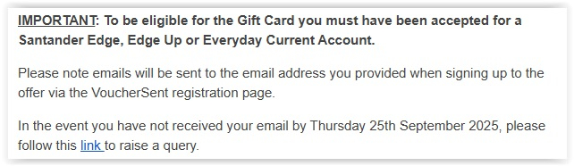 But a couple of hours later, VoucherSent emailed me the Amazon voucher code, which I have now applied to my account. All's well that ends well - but do keep all your emails from VoucherSent and the Santander OLA number until you have received the promised voucher.