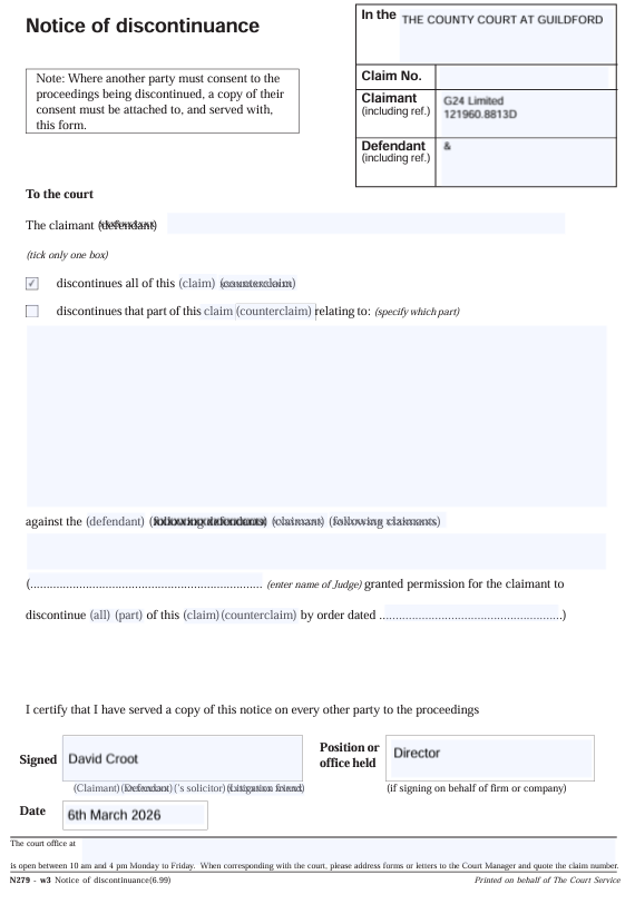 After one last attempt to squeeze £60 from me 'before sending this all to court' - which I ignored - I received a discontinuance. Huzzah!!5 -