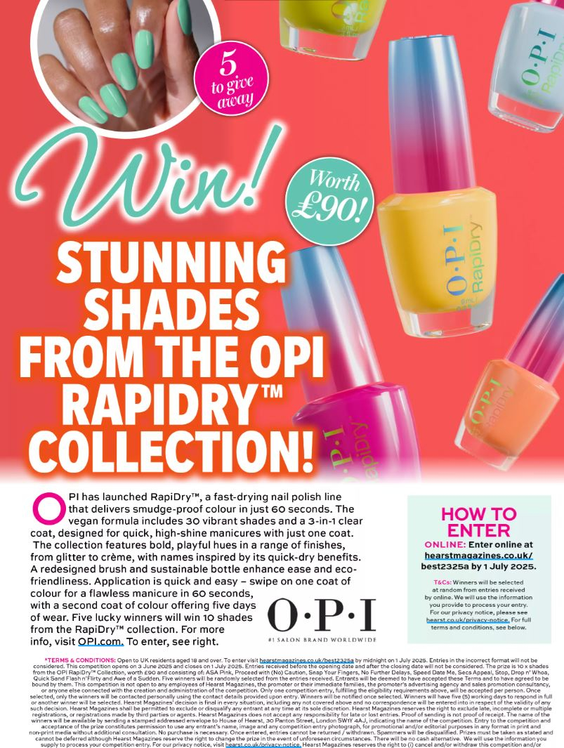 The prize is 10 x shades from the OPI RapiDryTM Collection, worth £90 and consisting of: ASA Pink, Proceed with (No) Caution, Snap Your Fingers, No Further Delays, Speed Date Me, Secs Appeal, Stop, Drop n’ Whoa, Quick Sand Flash n’Flirty and Awe of a Sudden. Five winners will be randomly selected from the entries received.