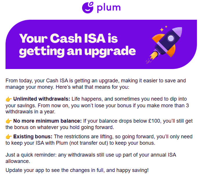 Recent changes to Plum's Cash ISAs.0