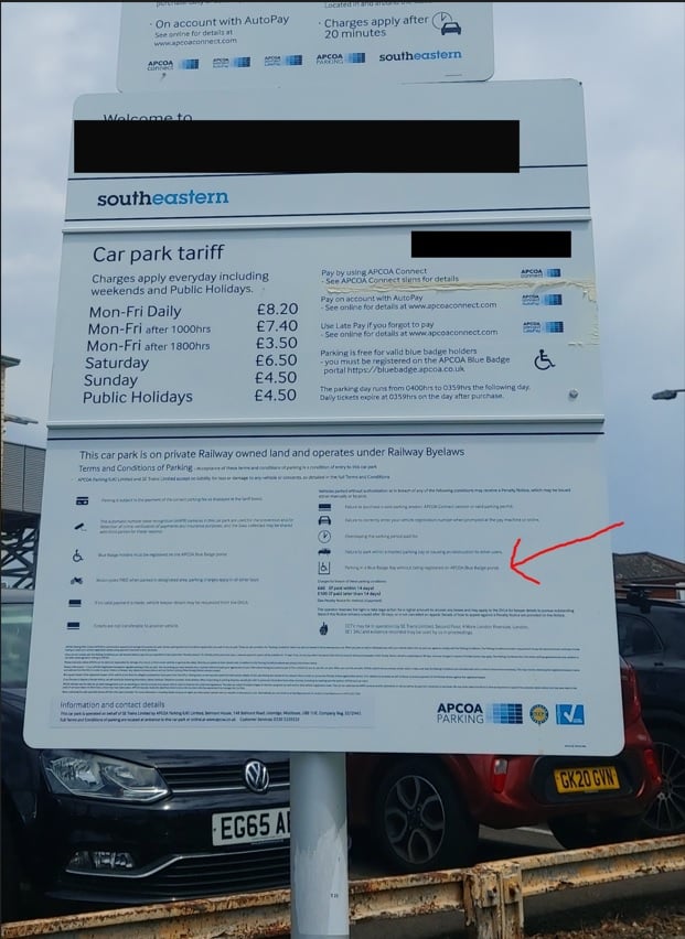 I've received a PN for apparently breaching byelaw 14 at a SouthEastern rail car park last month. I am disabled and have used a Blue Badge in disabled bays at the car park for several years. This is the first time I've received a PN. Apparently, it was issued because I failed to register my Blue Badge on the APCOA Blue Badge portal. I didn't know I had to do that. There is no prominently displayed information at the car park informing Blue Badge holders of the need to do this. I returned to the car park today and looked at the signage. There is a small notice of this requirement on the board. (I've tried to attached a photo, but the post doesn't allow it.)