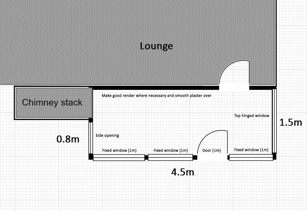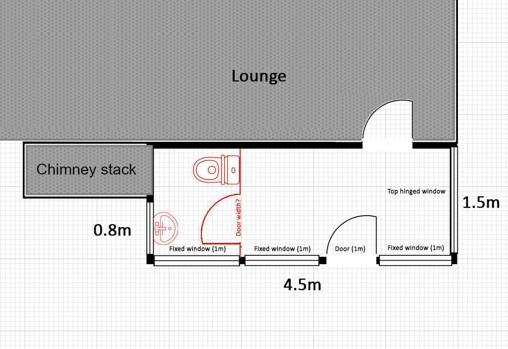 The measurements on the plan don’t add up to 4.5m. 1m is a really big front door. 1m might be doable for the loo, but you’ll be squeezing over to one side to close the door.No reliance should be placed on the above! Absolutely none, do you hear?0
