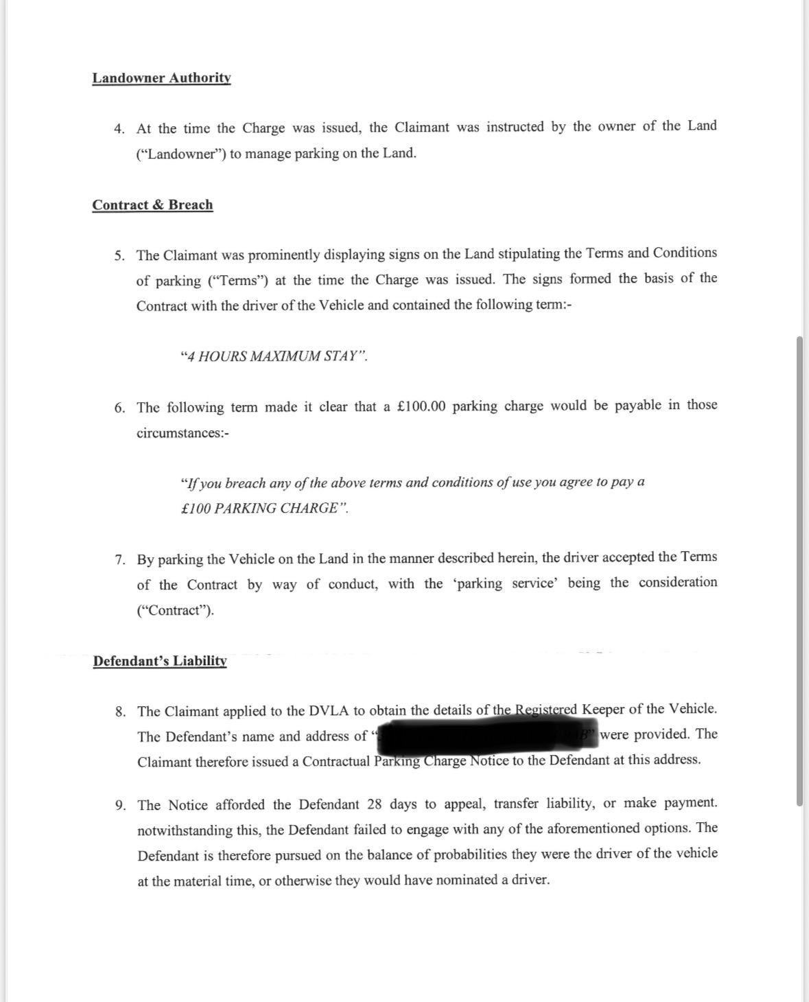 3. Referring to the POC: paragraph 1 is denied. The Defendant is not indebted to the Claimant. Paragraph 2 is denied. The Defendant does not accept that a contravention occurred on 14/05/2024, as alleged.  Whilst the Defendant is the registered keeper, paragraphs 3 and 4 are denied. The Defendant is not liable and has seen no evidence of a breach of prominent terms.  The quantum is hugely exaggerated (no PCN can be £170 on private land) and there were no damages incurred whatsoever.