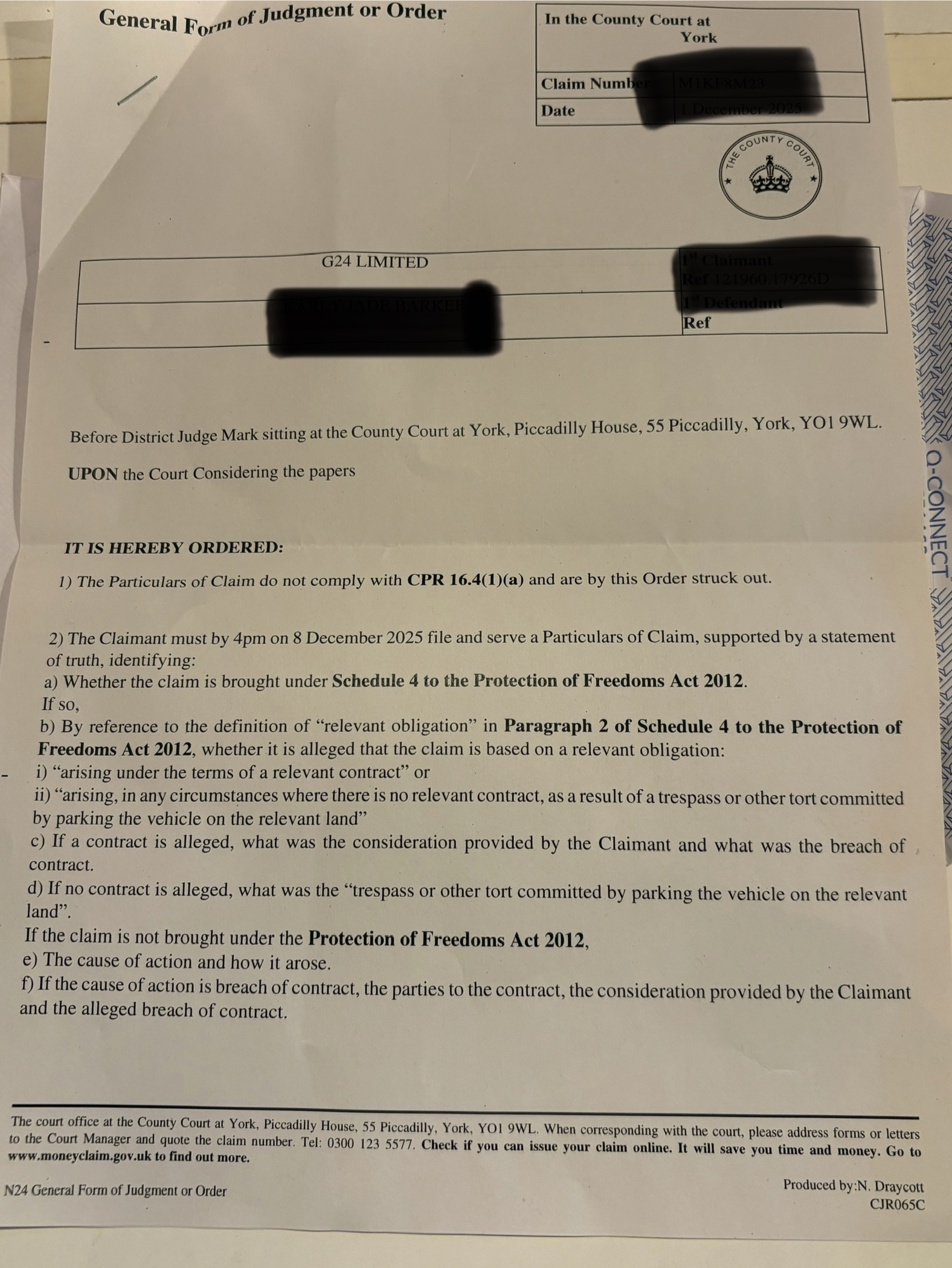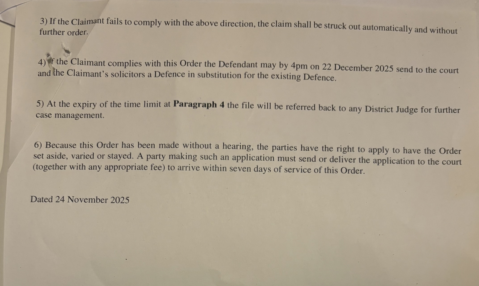 a letter and an email this morning. The court has asked for a new POC to be written, I have received this and now can reform my defence.