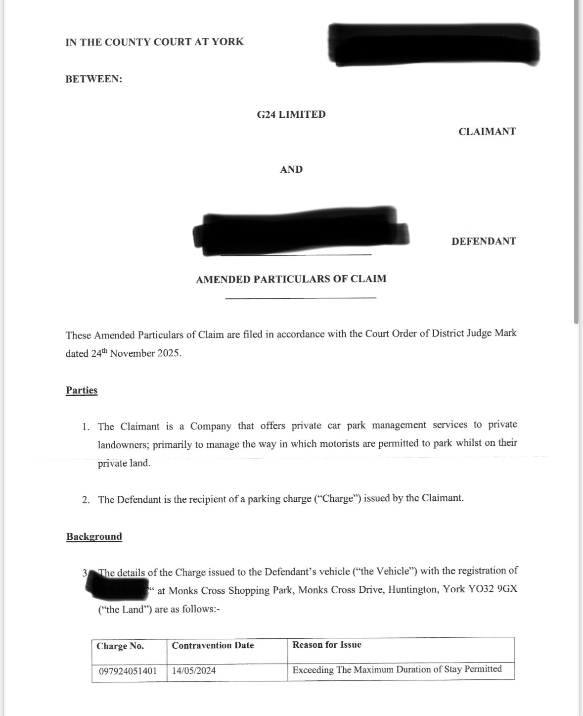 4. Due to the length of time, the Defendant has no specific recollection of the day in question or whether they or another driver may have visited twice that day over 18 months ago. The Defendant has parked in this car park many times while shopping at Monks Cross Shopping Park. The signage was unremarkable compared to the large lettering on banners and posters all over the site advertising offers from the retailers and no terms from G24 were noticed or read on any occasion. The Defendant had never heard of the Claimant, whose signs were not sufficient or adequate to fairly alert a motorist, leading to a genuine unawareness of any parking restrictions.