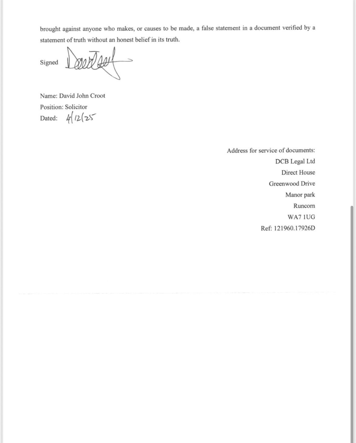 I believe that the facts stated in this amended defence are true. I understand that proceedings for contempt of court may be brought against anyone who makes, or causes to be made, a false statement in a document verified by a statement of truth without an honest belief in its truth.