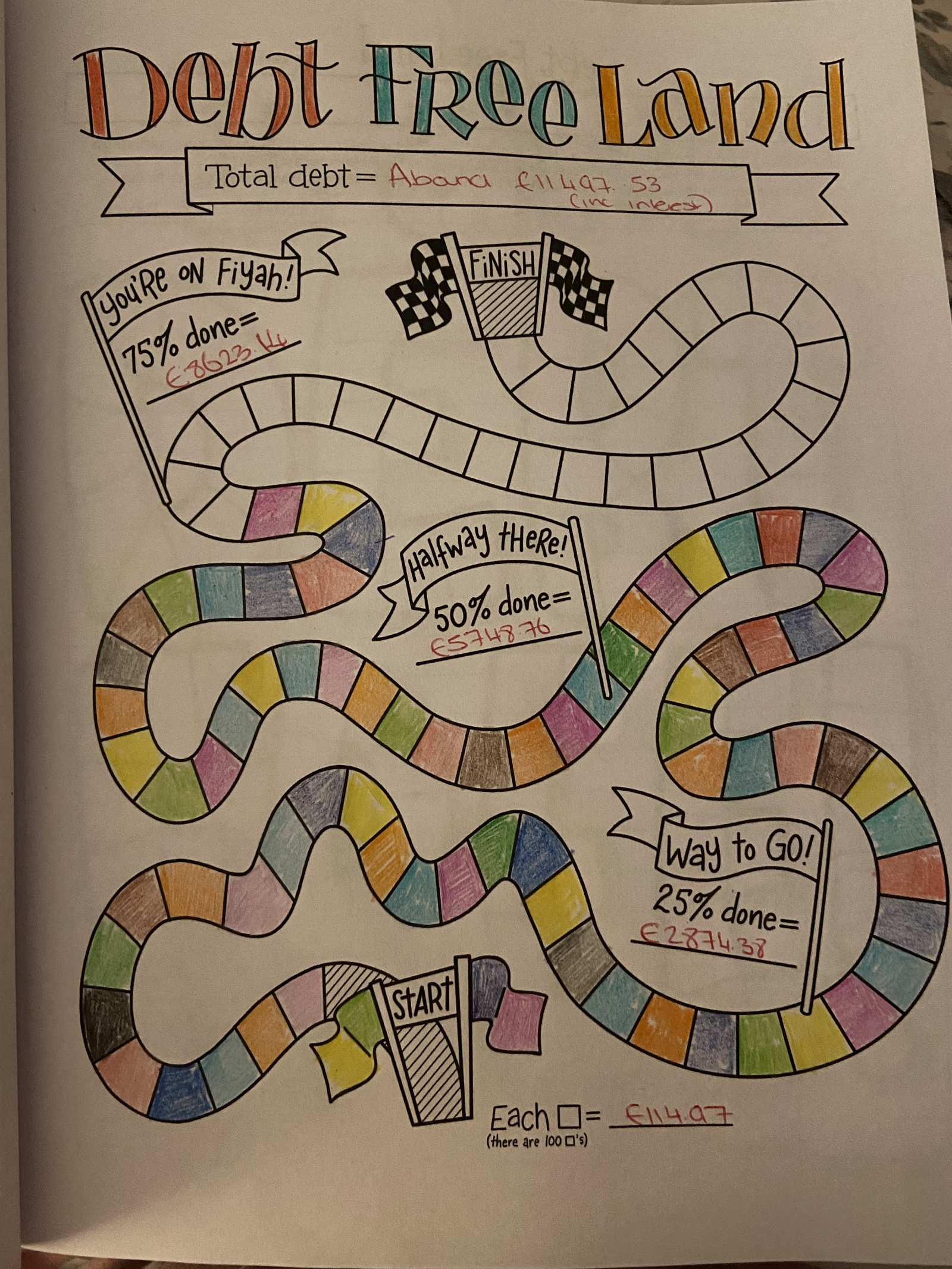 I bought one of those debt colouring in books last night, it's been sat in my Amazon basket for months. Feels quite therapeutic colouring the boxes in (this is only one debt unfortunately, I'd love to be that close to the end with them all) and I've just realised how untidy my colouring is 🤣🤣 it looked okay until I took a picture, I blame the poor lighting in the room, due to the little one sleeping 😉4