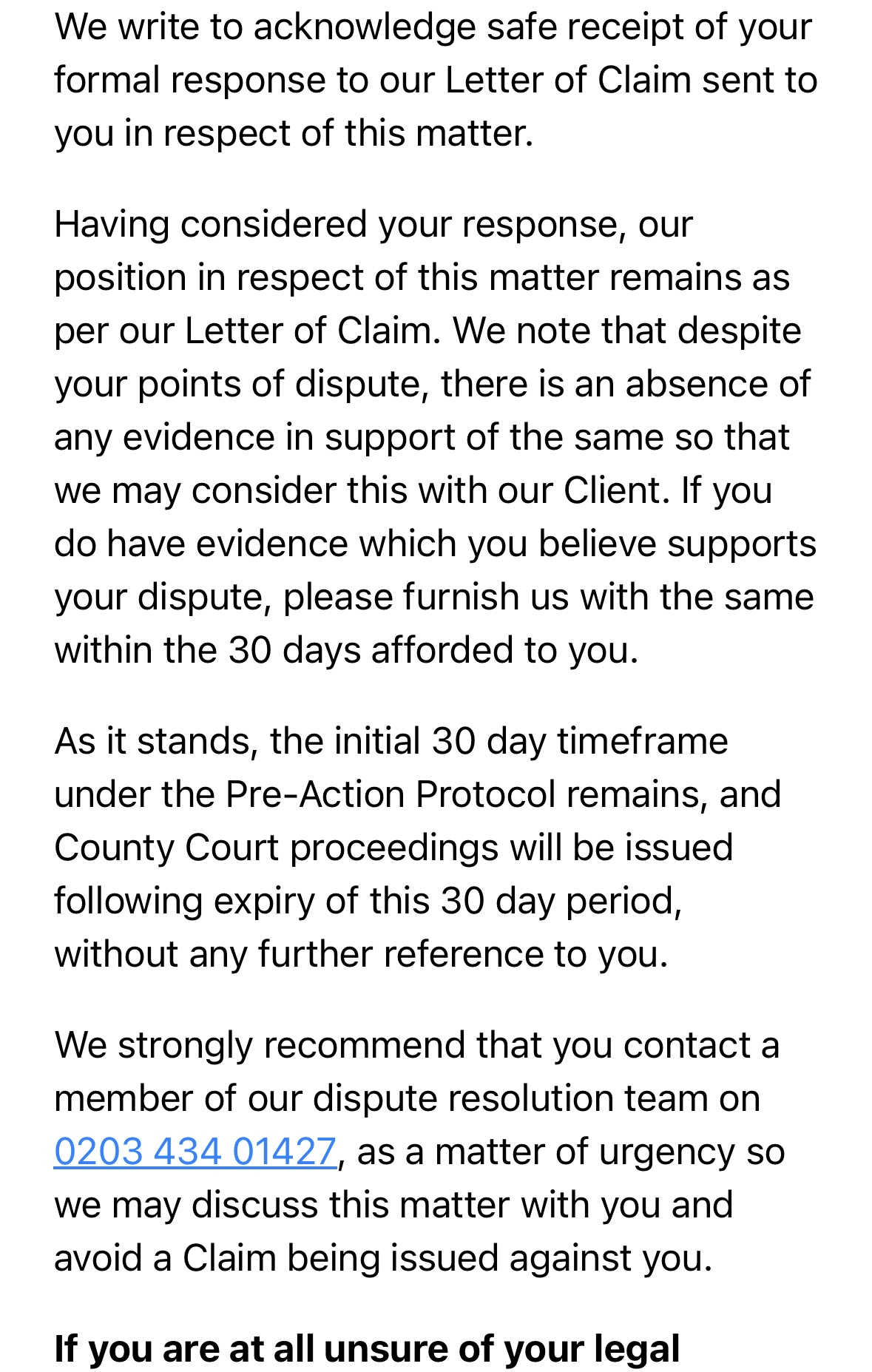 This letter from DCB Legal is their new template response and makes no attempt to deal with the issues raised.