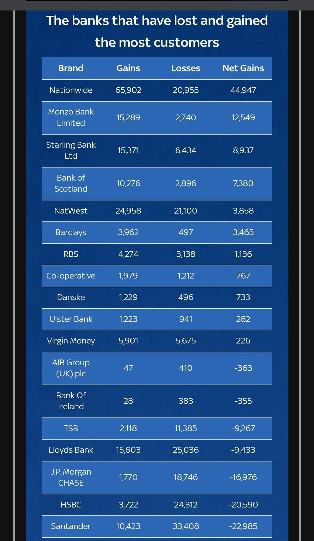 From Sky News. Santander has a nett loss of almost 23,000 customers. Wonder how many are due to their conduct related to 'Free Forever' accounts they've done a Uturn on !Well they made significant changes everywhere like the retail 123 lite account and all other business accounts they had so it’s no surprise on the numbers. Bit like Chase who did same/top saving rate expiring and also lost a lot.0 -