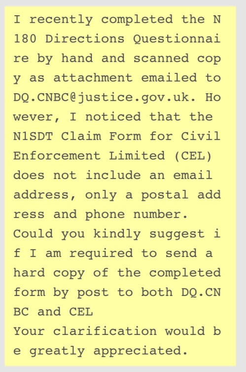I recently completed the N180 Directions Questionnaire by hand and scanned copy as attachment emailed to DQ.CNBC@justice.<span>gov.uk</span>. However, I noticed that the N1SDT Claim Form for Civil Enforcement Limited (CEL) does not include an email address, only a postal address and phone number. Could you kindly suggest if I am required to send a hard copy of the completed form by post to both DQ.CNBC and CEL Your clarification would be greatly appreciated.