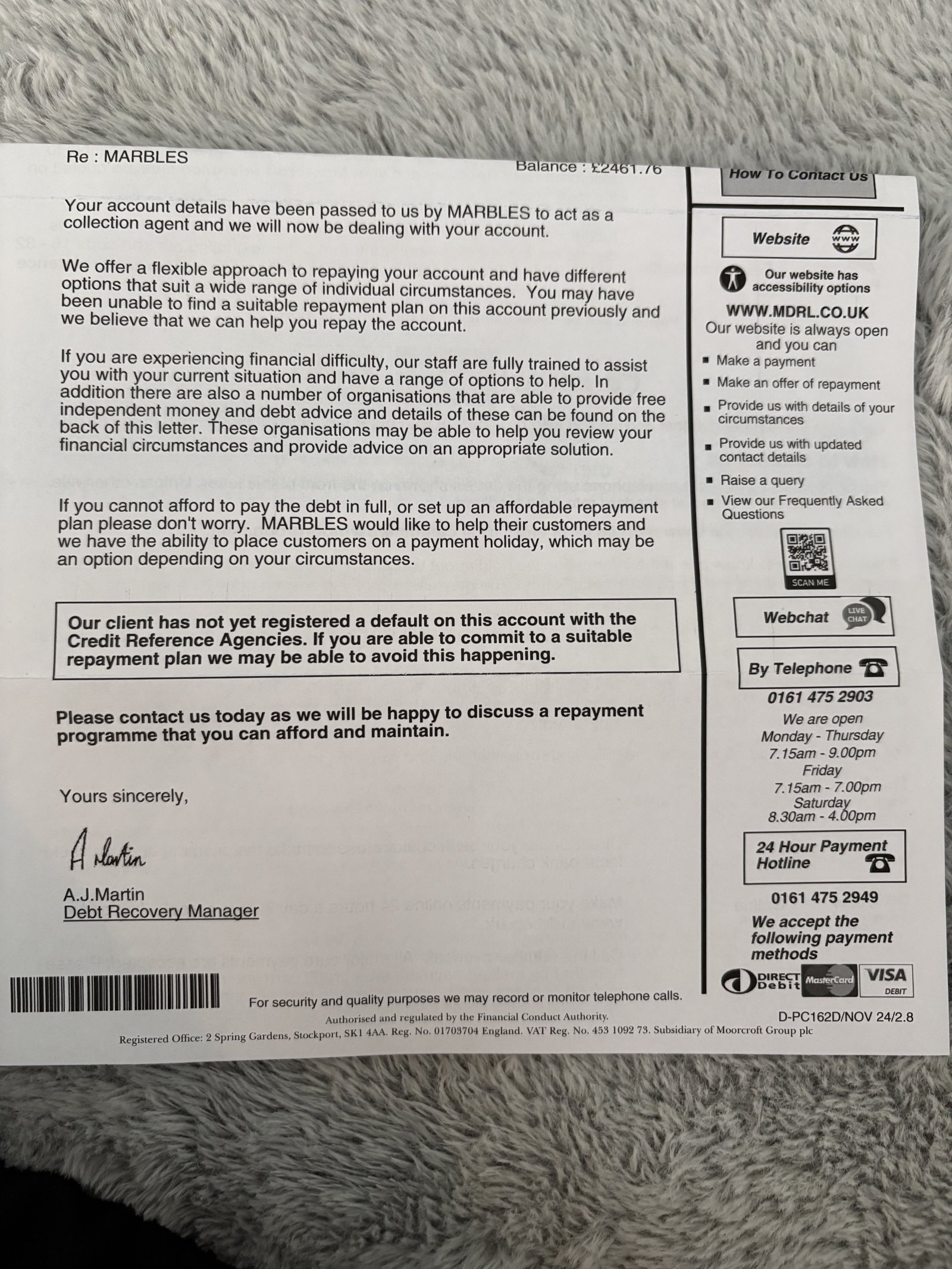 Had this letter today from moorcroft and exactly same letter from them about my aqua credit card. I guess just ignore and keep waiting for the default. Can anyone tell me how I know once the default is on my Experian? Is there a certain symbol I look for? Like missed payment is a Red Cross is there one when the account is in default I can look for? Once I see this I can then negotiate with moorcroft a payment plan