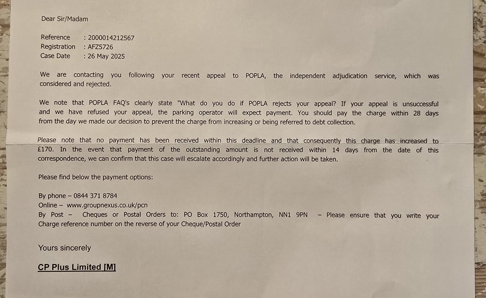 You have already appealed to Group Nexus and escalated the matter to POPLA, which is the independent and final stage for PCN disputes. We appreciate that you are unhappy with their decision; however, this does not change our process or position. There are no further steps that Moto can take in this matter.
