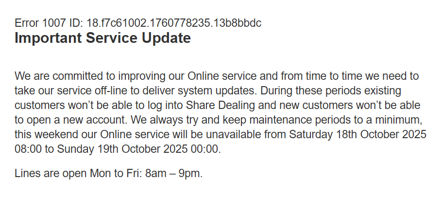 masonic said:This was planned maintenance. I saw a warning about it on Tuesday when I logged in to iWeb to check something. In fairness they've got a better record than Interactive Investor, who while I was with them had the habit of taking services down almost every weekend, often both Saturday and Sunday.1