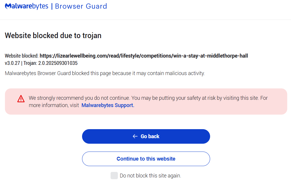 When I click on the link to the Liz Earle website, I get a warning about a potential