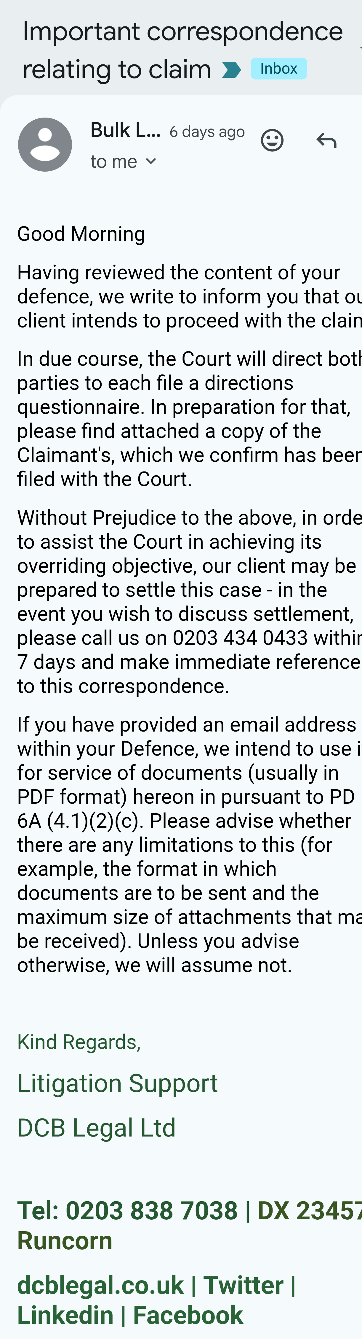 Hello ,just an update on this, I have had this email from DCB Legal.I'm assuming I'm to ignore any phonecall offer and wait for the courts to send me the next steps? Also what is the timeframes I should expect for the next stage such as mediation etc?Many thanks!0