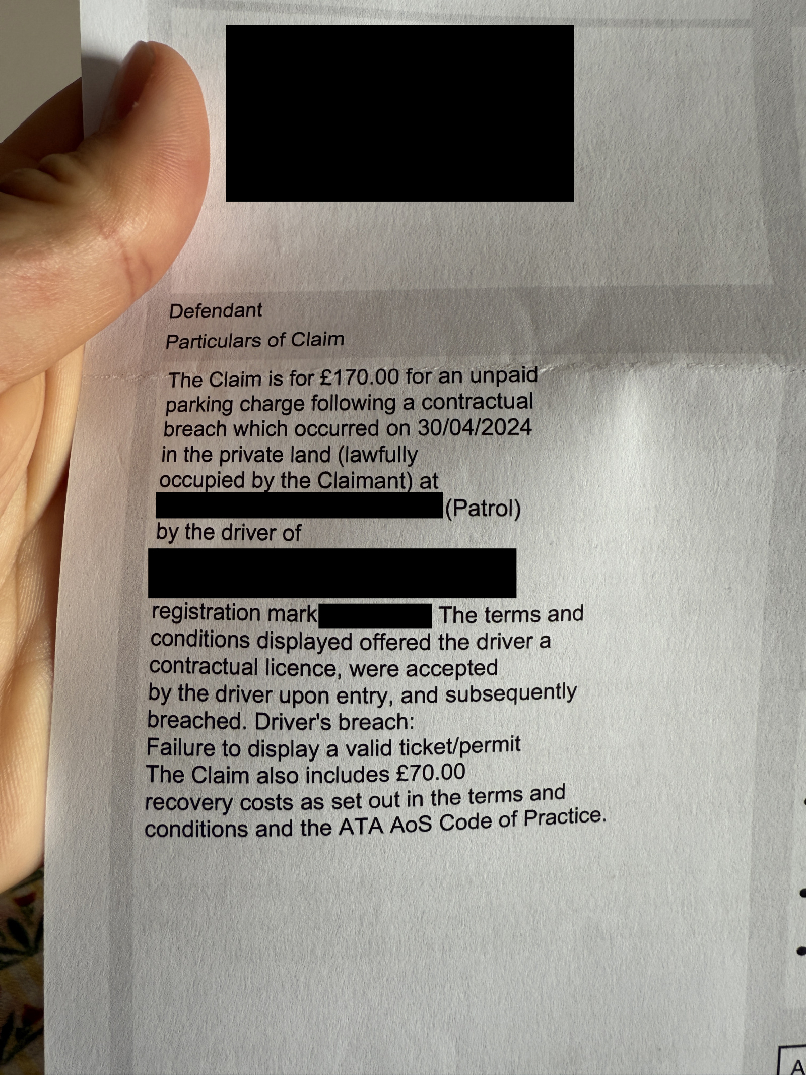2. ...3. The Defendant has a leasehold interest in the land which grants primacy of contract and an unfettered right to park, with no requirement to display permits or comply with terms unilaterally imposed by third parties. The Claimant has no authority from the landowner to interfere with those rights, nor can any such terms override lease provisions or the Defendant’s right to quiet enjoyment (Link Parking v Ms P [2016]). Further, the Claimant has previously issued proceedings regarding other Parking Charge Notices (PCNs) at the same location and concerning the same vehicle and facts. On 17 May 2025 the Defendant raised with BW Legal that such matters ought to have been consolidated. The Claimant’s failure to do so and pursuit of piecemeal claims amounts to unreasonable conduct and an abuse of process, caught by cause of action estoppel (Henderson v Henderson [1843]). Accordingly, the claim is wholly without merit and should be struck out.