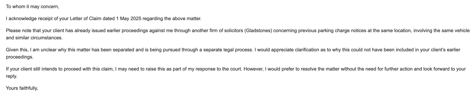 6. The Defendant notes that the Claimant (or their legal representatives) has previously issued proceedings regarding earlier Parking Charge Notices (PCNs) concerning the same vehicle, location, and circumstances. On 17 May 2025, the Defendant emailed BW Legal in response to a Letter of Claim dated 1 May 2025, specifically raising this issue and asking why these matters had not been included within their client’s earlier proceedings. No response was received.