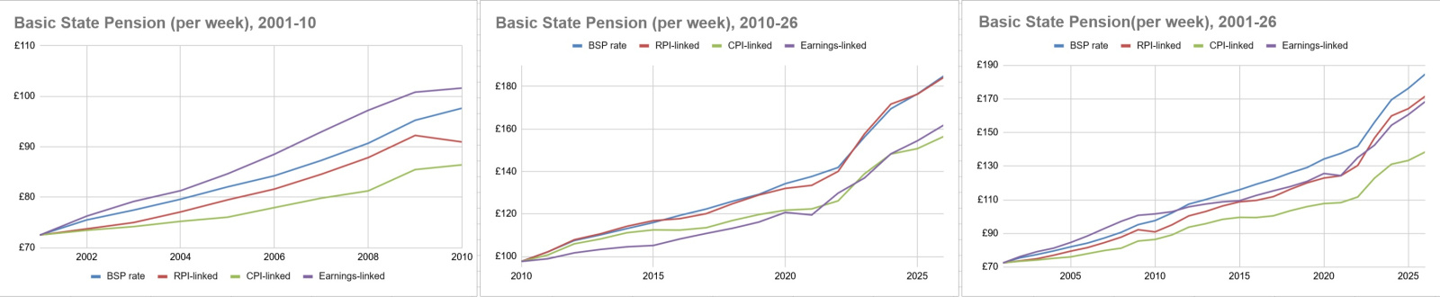 Here are charts comparing the rate of Basic State Pension since 2001 and 2010 to what it would have been under different upratings, through to 2026 (assuming uprating of 4.8% in April 2026, which is subject to confirmation).How earnings have fared relative to inflation depends on whether the comparator is RPI or CPI. Earnings growth has closely matched RPI over the last 25 years, with both earnings and RPI being noticeably higher than CPI.A few interesting points:- Since 2001, the State Pension is more than 33% higher than it would have been if uprated in line with CPI