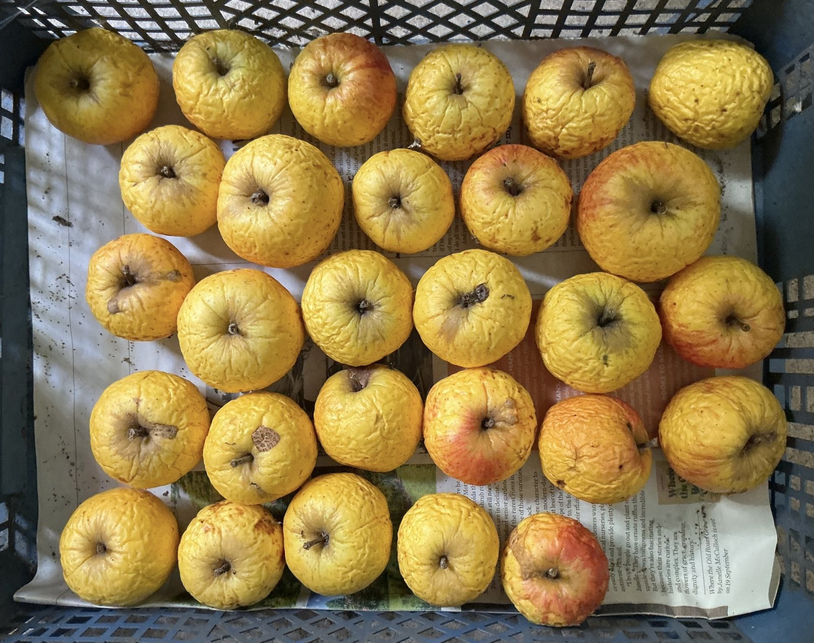 We had a good apple year in 24, with very few grubs in the untreated apples. They lasted into May, a bit wrinkled but still tasty. Most of these were used up in wholemeal apple crumbles, cored and sliced but with the peel still on, and as baked apple, cored and stuffed with mincemeat.