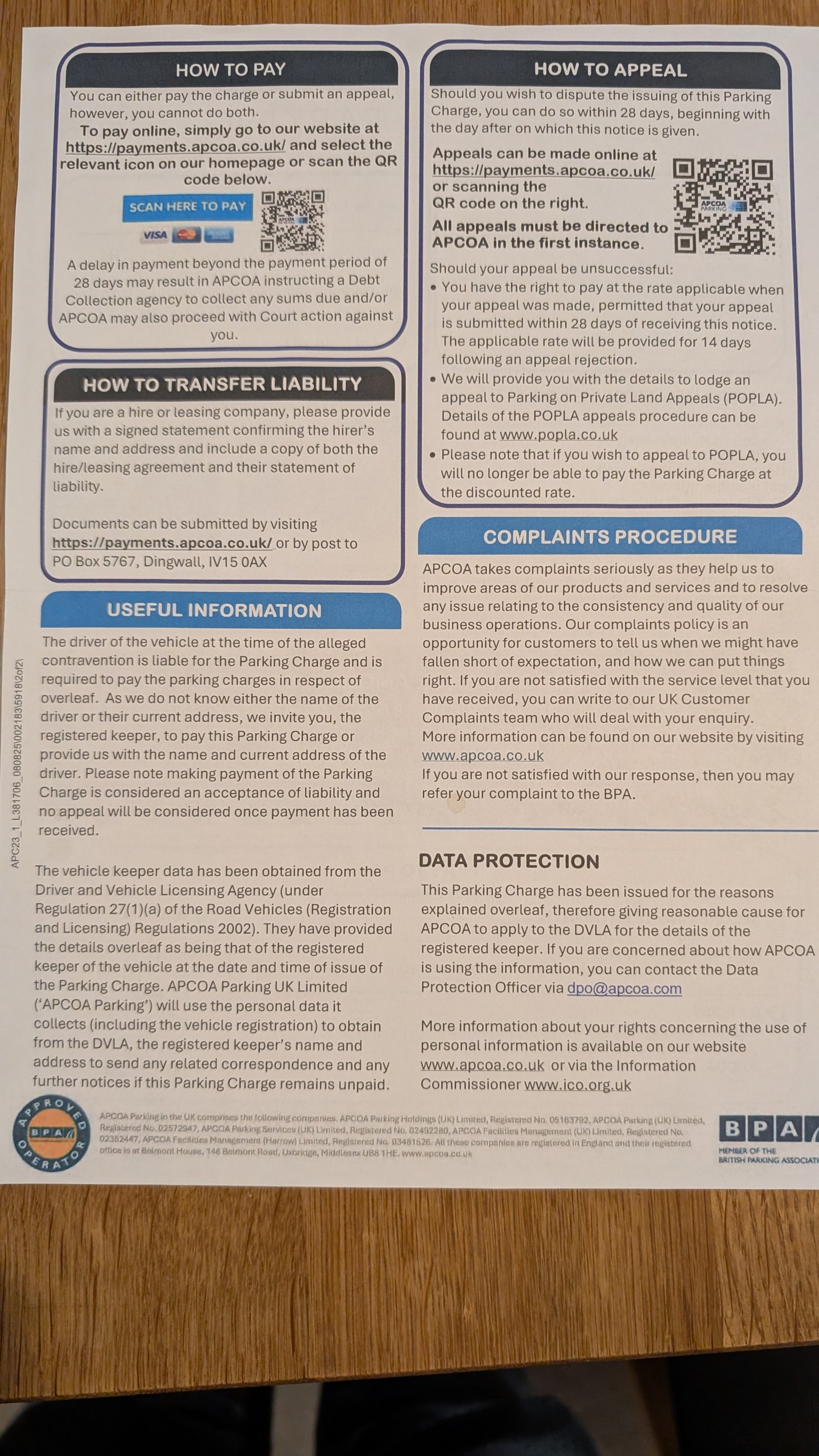 Could you show the back of the PCN please because it looks like it has changed since I last captured an image of an APCOA NTK. Thanks!PRIVATE 'PCN'? DON'T PAY BUT DON'T IGNORE IT (except N.Ireland).