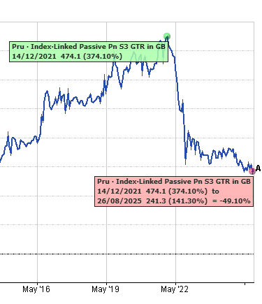I don't know what made you select it but your decision was poor. So, you cannot blame Pru.t or to hang on to the current investment past retirement date and hope S3 index products recover in a few years time?Not going to happen. the drop was the unwinding of the boom in index linked gilts following the credit crunch and it is now back in line with its long term average.