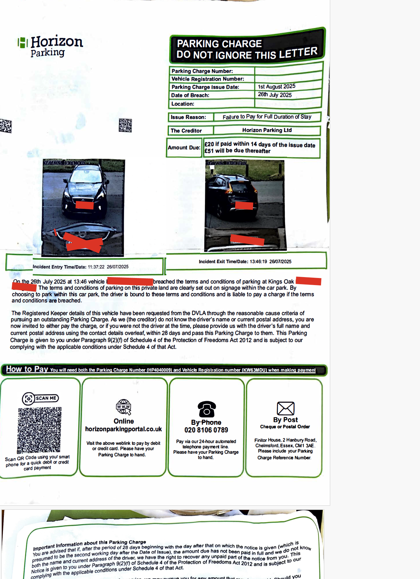 Horizon Parking NTK PCN letter for £51 / £20 for 129 minutes on site, presumably 120 minutes was paid for by some method