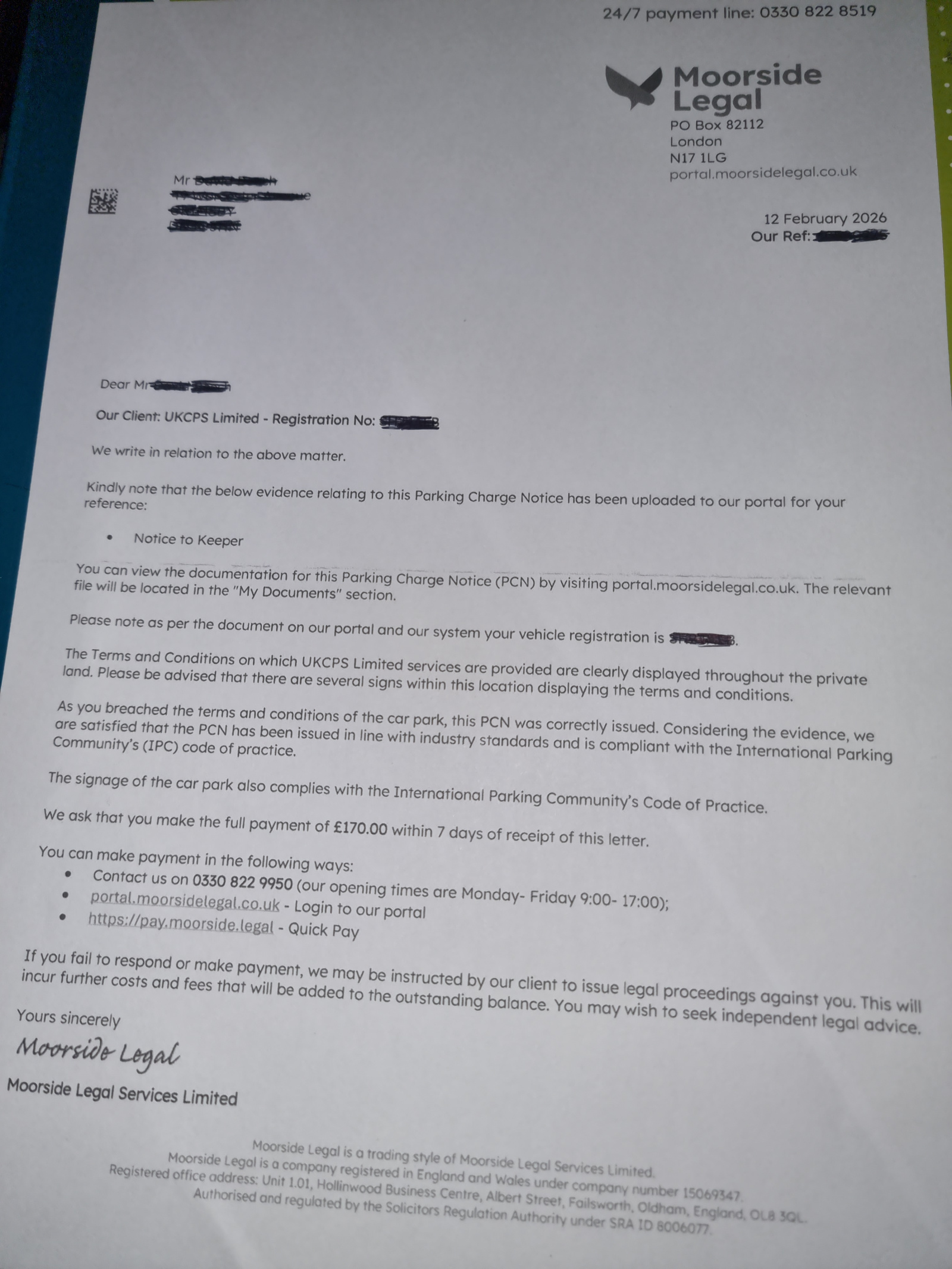 A little update on this. Its now with Moorside Legal. They've also sent letters demanding £170. The one above is the first time they've got the correct registration. I'm assuming ill just await the inevitable court papers now?