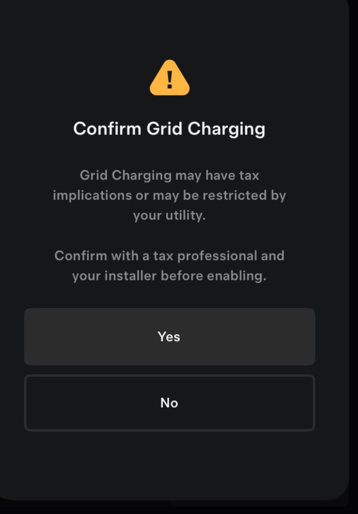 Clicking yes just takes me back to the previous screen so I can’t charge the battery from the grid at the moment. I assume the installer has set this up in this way and I have requested charging be allowed. I have opted for time based control setting a peak period of 1600 to 1900 and the PW3 has just taken over the house load (having been delivered with 21% charge). I just don’t know how it will charge up again.