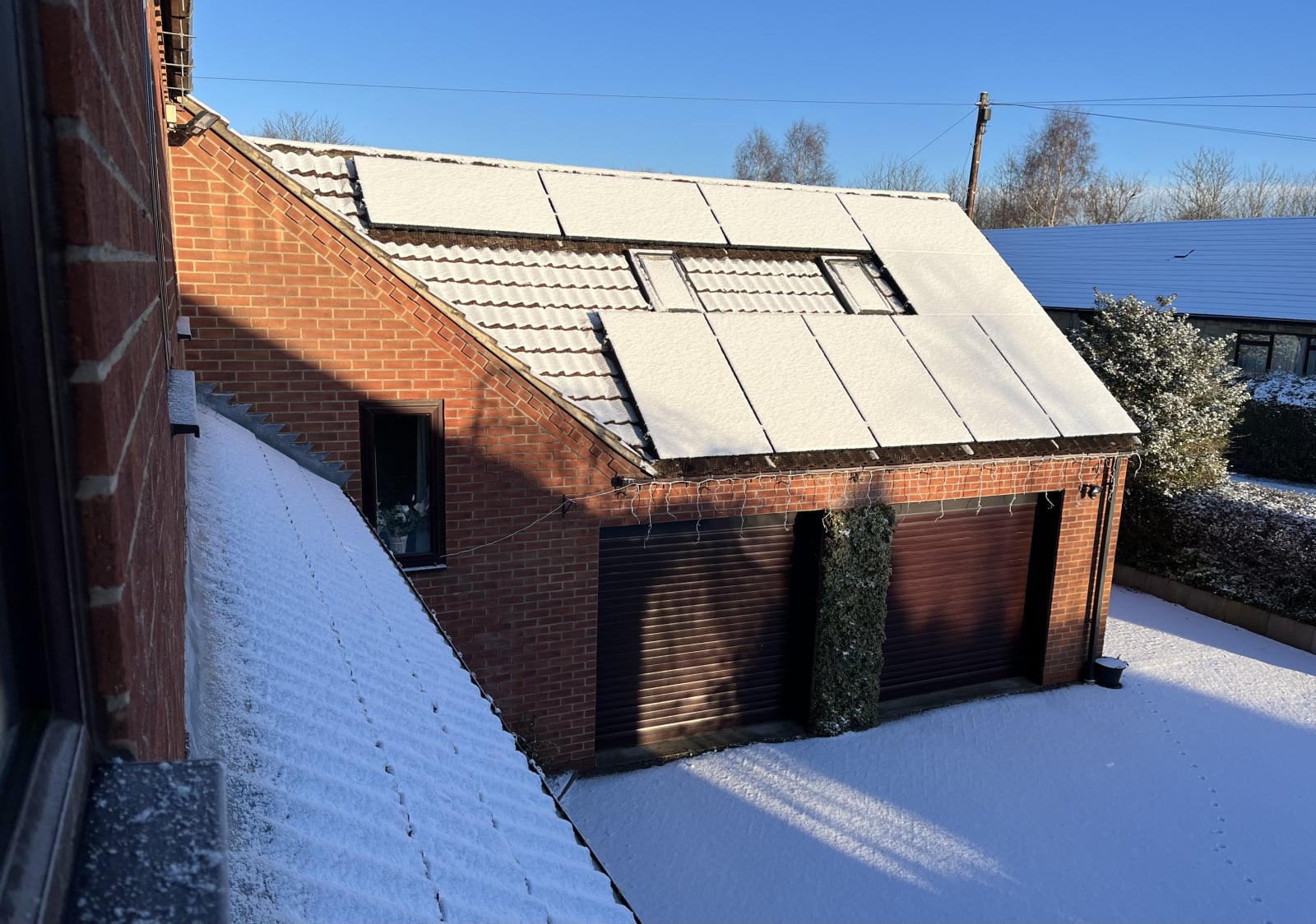 It snowed last night and my new panels are still covered. I am however generating 0.2kW. Is this because the panels are bi facial or is a bit of sunshine bleeding through the snow? The snow does let me see that there is some shading from a neighbours trees that I had not previously noticed.