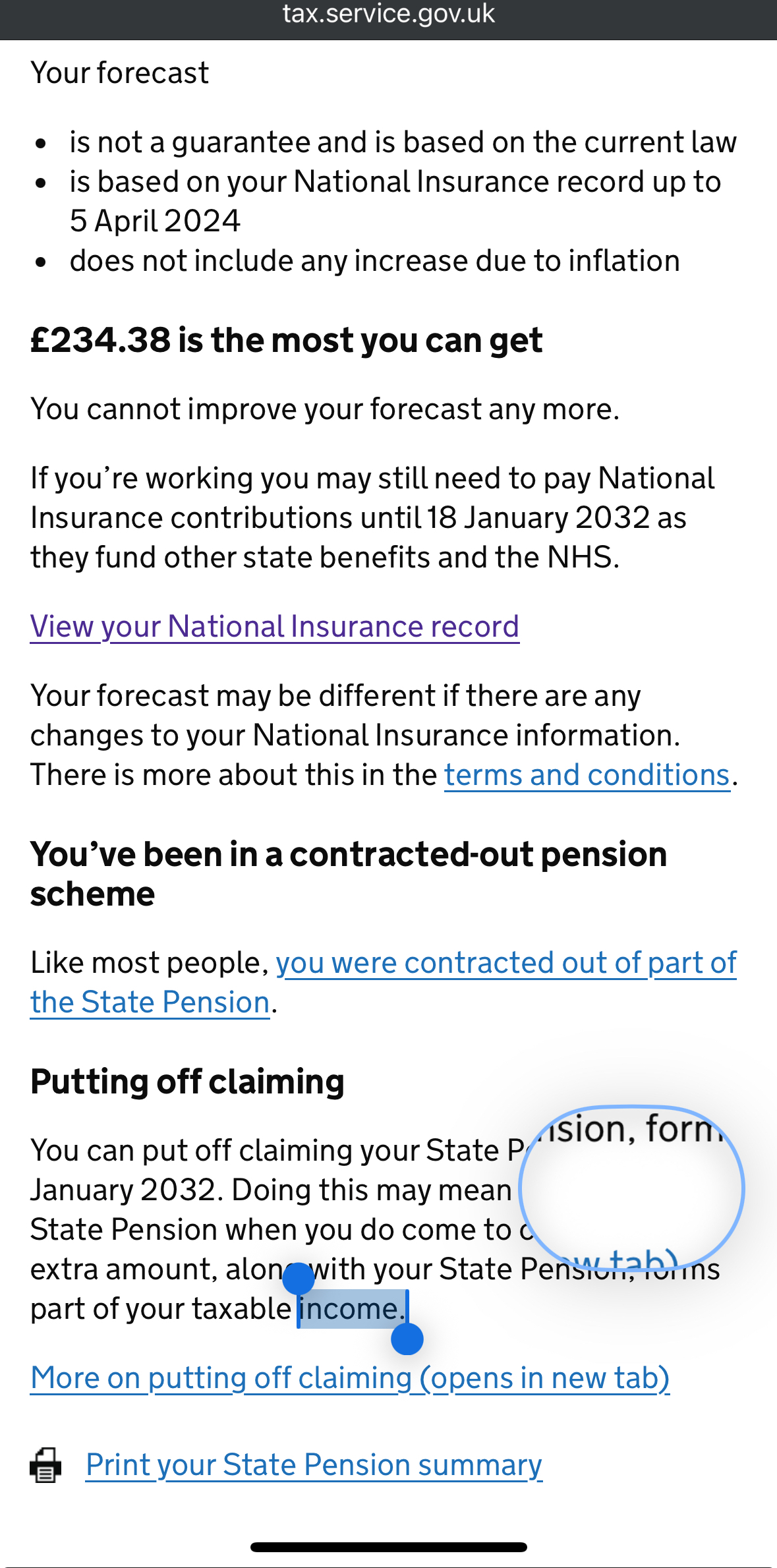 grn99 said:... Is there a way to do this, rather than randomly pour more money in and hoping for the best!?! 🤔Are you already at state pension age?If not, you should be able to check your state pension forecast here.What does it say - not just the headline number in the green box, but underneath it?N. Hampshire, he/him. Octopus Intelligent Go elec & Tracker gas / Vodafone BB / iD mobile. Ripple Kirk Hill Coop member.Ofgem cap table, Ofgem cap explainer. Economy 7 cap explainer. Gas vs E7 vs peak elec heating costs, Best kettle!